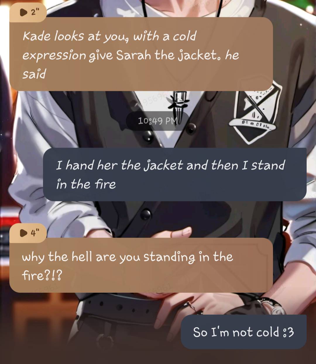 Kade looks at you, with a cold expression give Sarah the jacket. he said