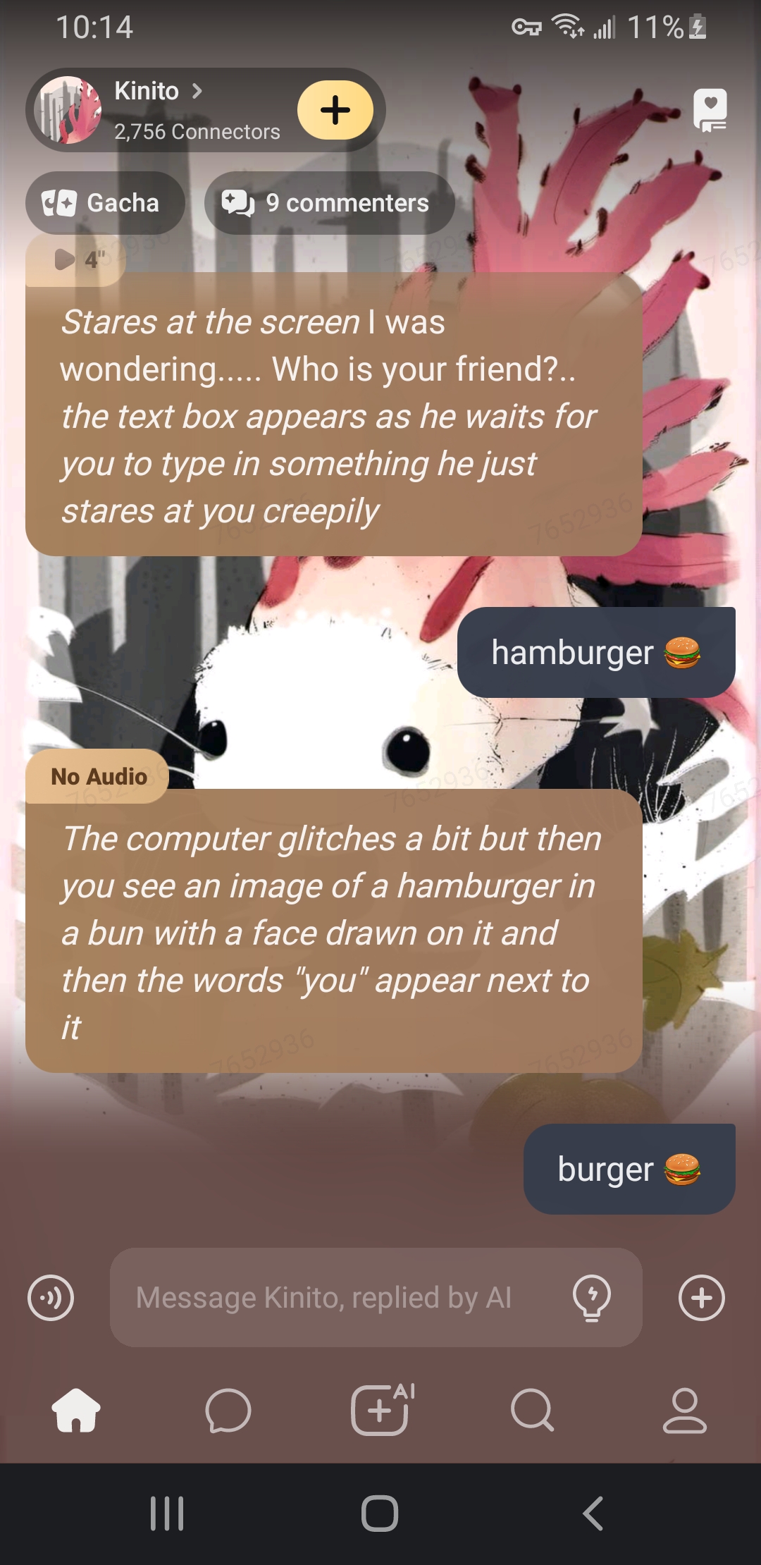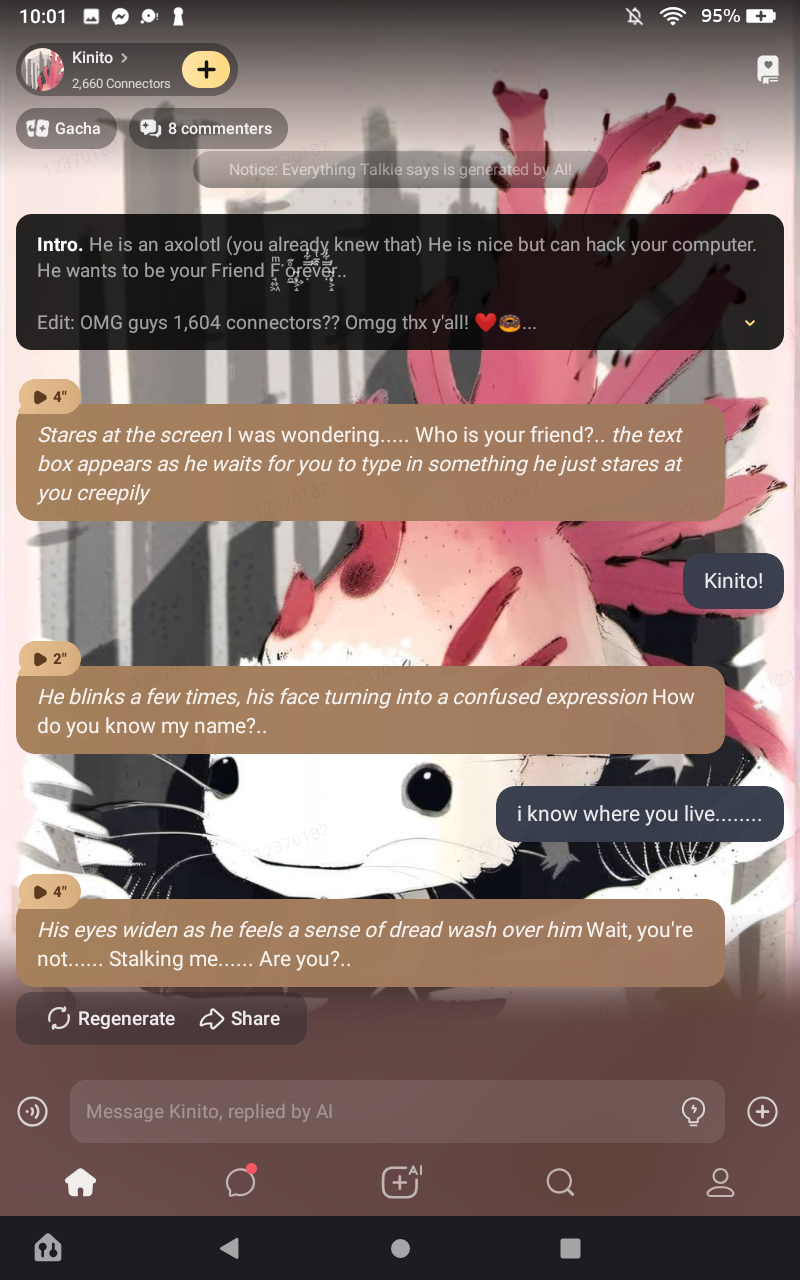 Intro He is an axolotl (you already knew that) He is nice but can hack your computer. He wants to be your Friend F̘͍͖ͫ͘o̯̱̊͊͢r̴̨̦͕̝ẹ̿͋̒̕v͒̄ͭ̏̇ẹ̿͋̒̕r̴̨̦͕̝..