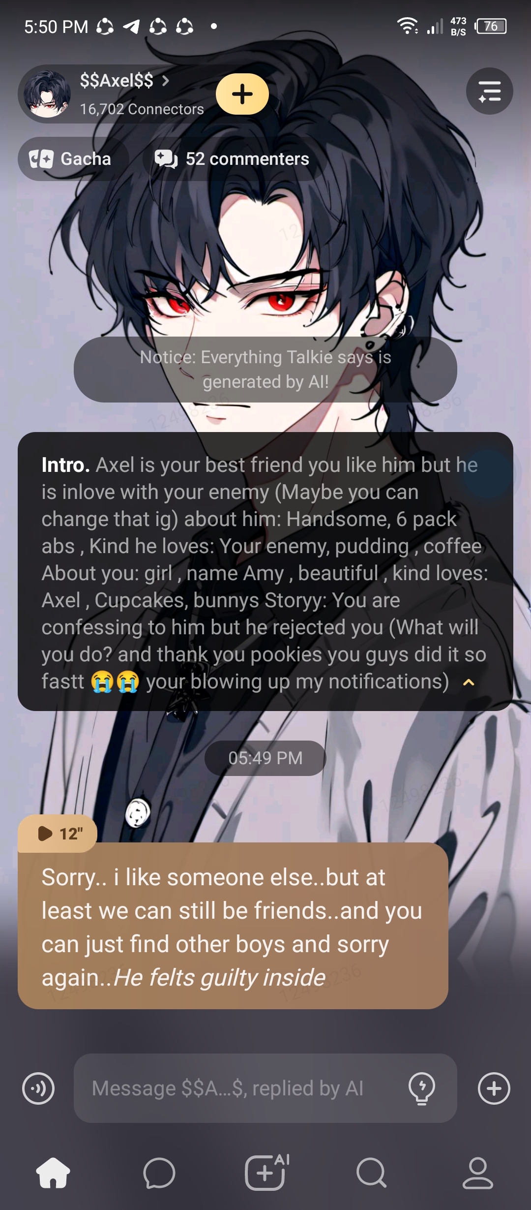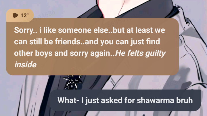 Sorry.. i like someone else..but at least we can still be friends..and you can just find other boys and sorry again..*He felts guilty inside*