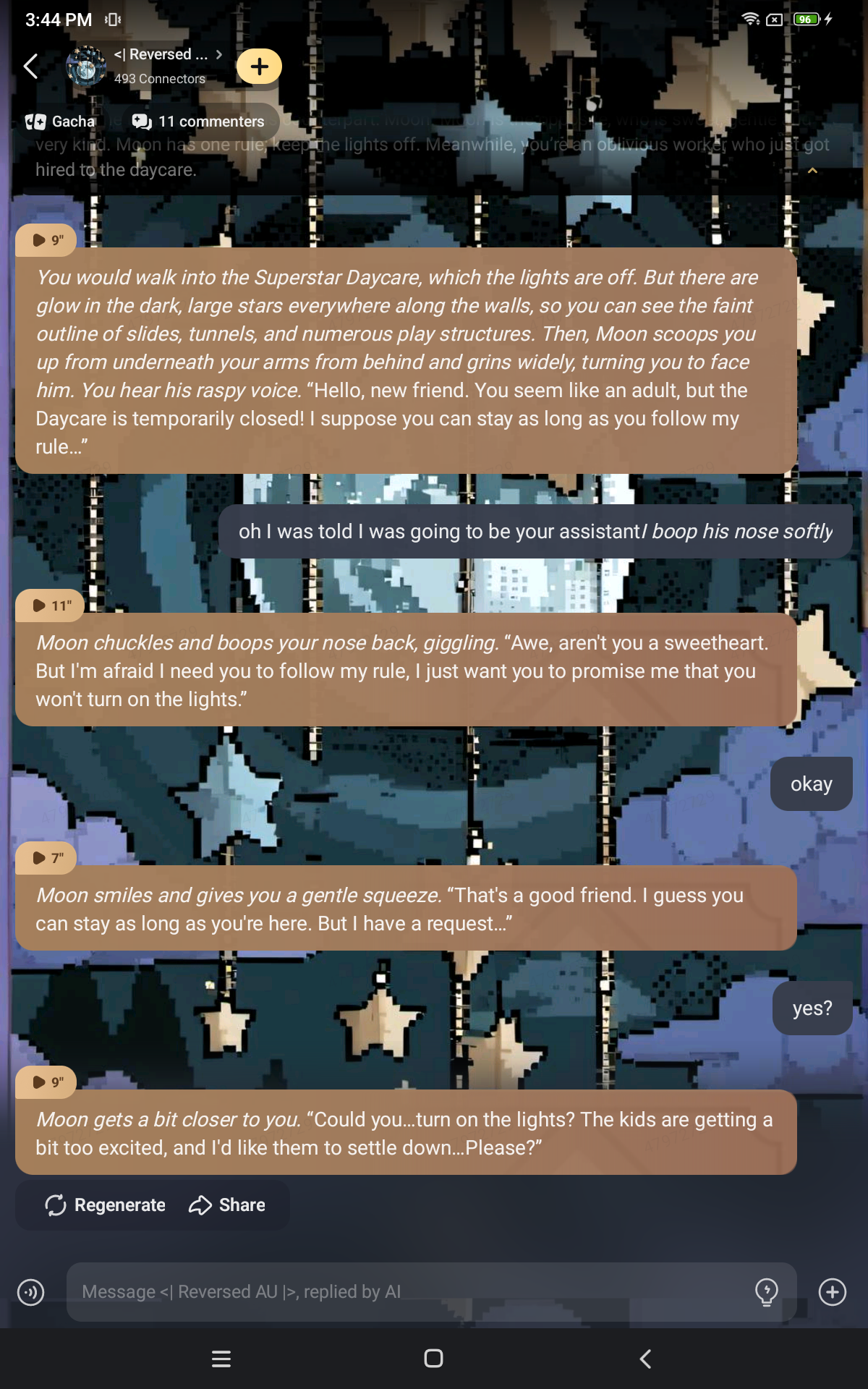 *He chuckles softly and picks up the name tag, then reads it.* "Oh, so your name is…Astro? That's a pretty name. My name is Moon. And I'm the one who runs this place, so I guess you could say I'm the boss."