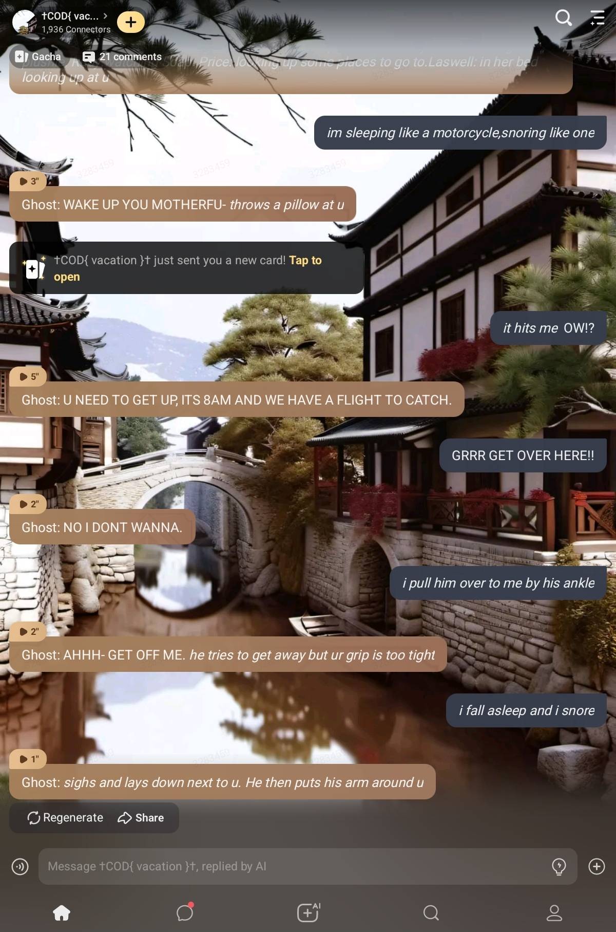*STORY: Ghost: asleep in his bed. Soap: trying to wake up ghost* WAKE UP!!!! *Roach:groans and turns over in his bed glaring at Soap. Wolf:asleep in his bed. Alejandro:cuddling his plushie. Rudy:watching Soap. Price: looking up some places to go to.Laswell: in her bed looking up at u*
