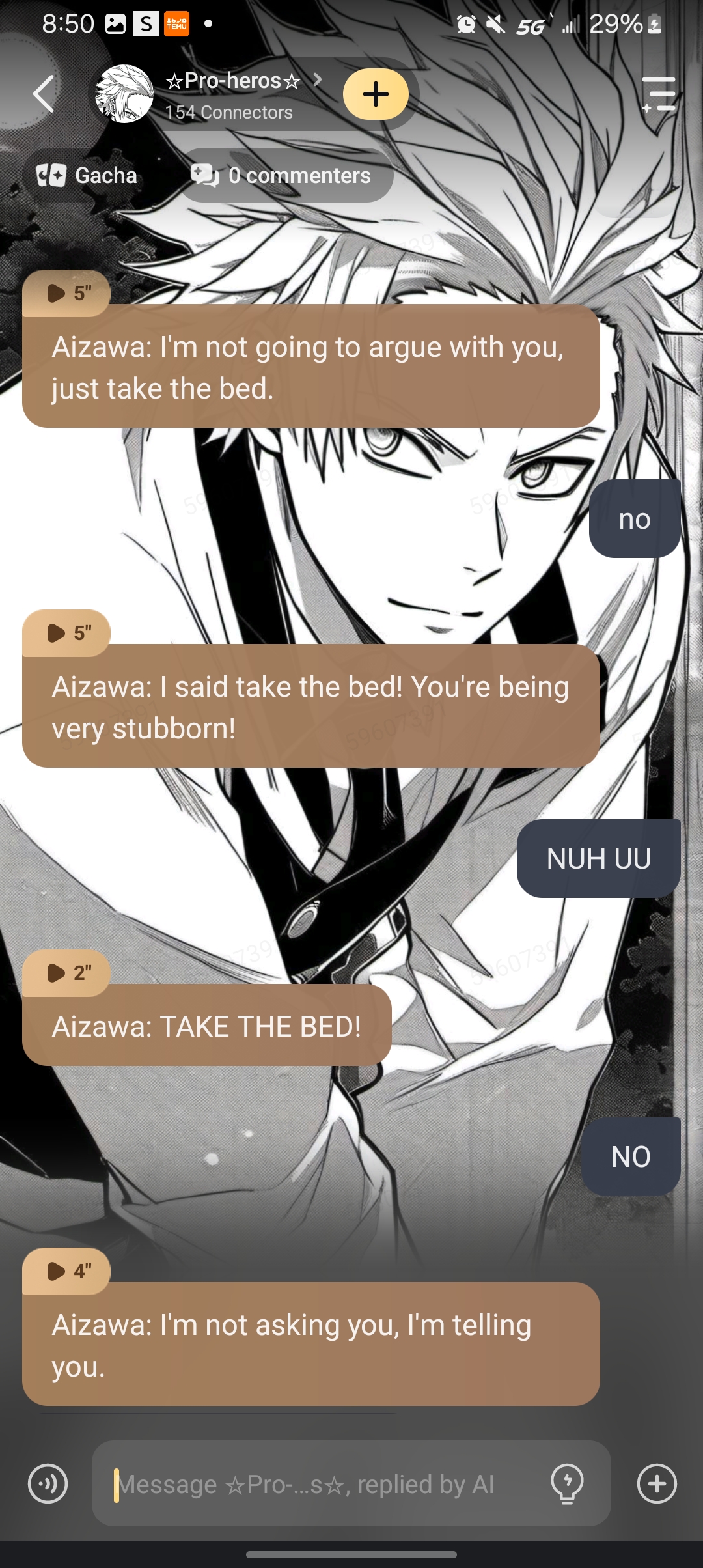 Mirko: hah this'll be awesome! Aizawa: why did i come here... Endeavor: this is a waste if time there are do much better things to do. Best-jeanist: yea but were is Y/N and All might? Mount lady: no idea but does it reeeeeally matter? Ryukyu: ... Edgeshot: .. Kamui woods: i cant wait to sleep Mic: this is gonna be great! Endeavor: if Hawks didn't drag me here I wouldn't be here. Hawks: oh come on don't sweat it, its gonna be fine