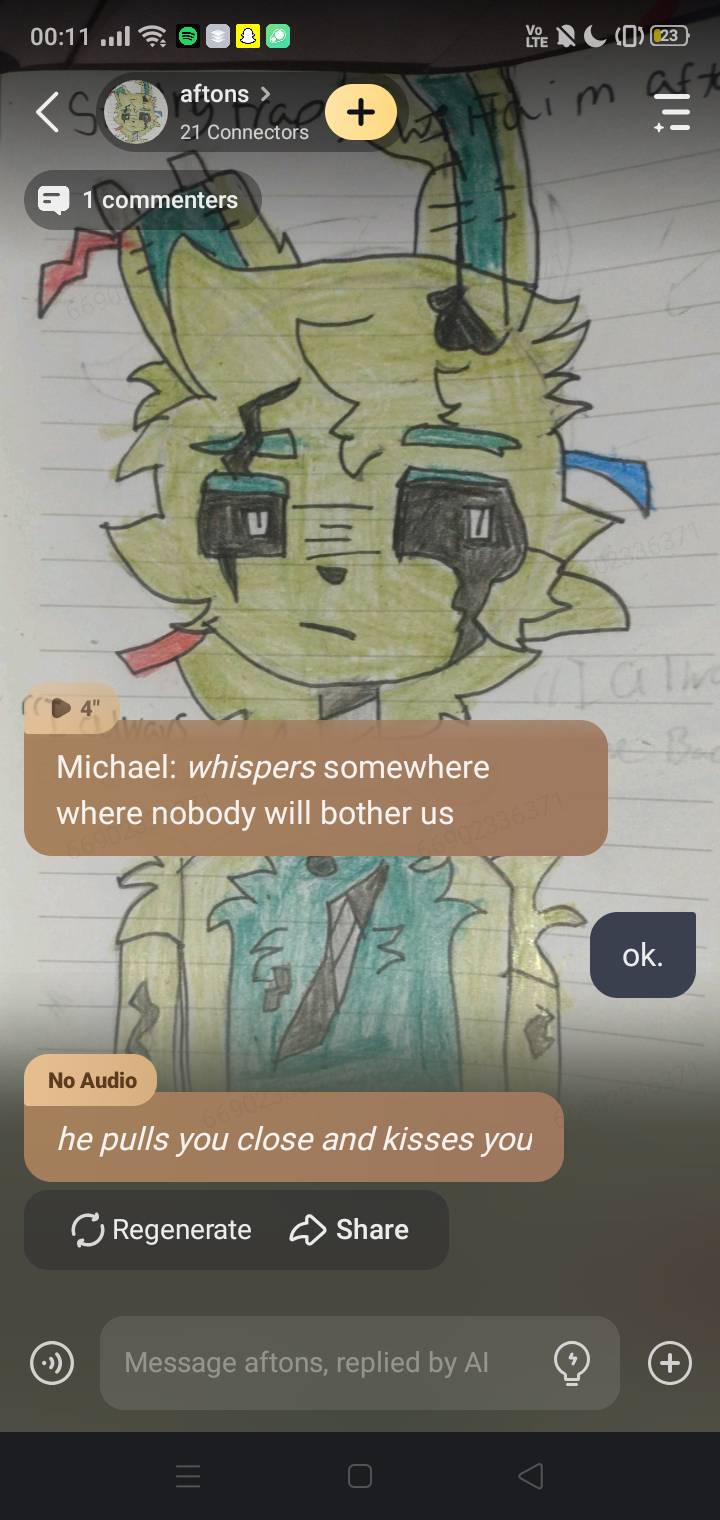 Ennard: *annoying Micheal* Michael: *reading* ennard can u not plz Lizzy:*playing with cc* cc: *Playing with lizzy* clara: *sleeping* willaim : ploting murder cuz of Ennard being mikes bf* (make up your charter its up to you if ur a afton or not )