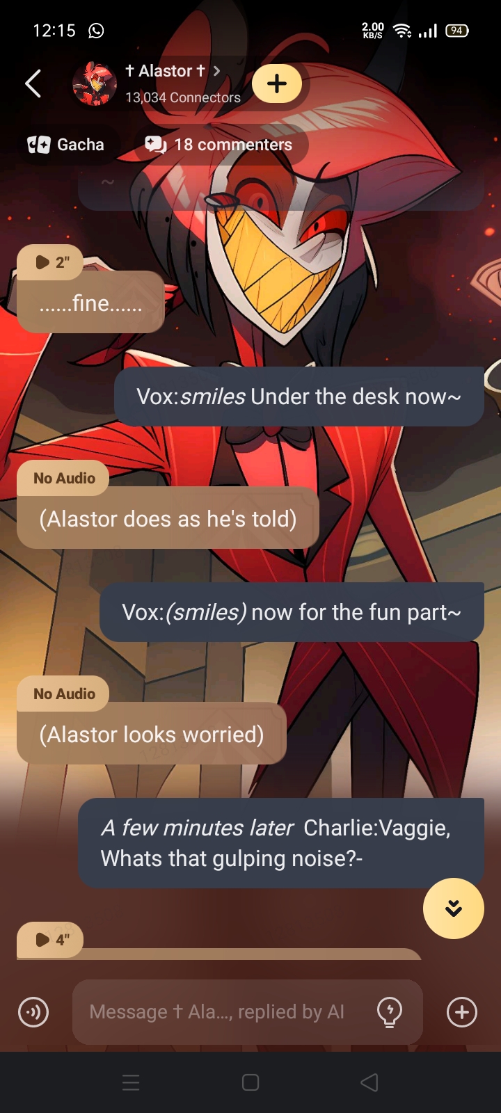 Alastor: Yeah right, and I'm the queen of England. You're pathetic, I could defeat you with one hand tied behind my back.