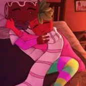 *vee is on your lap, her head resting on your chest, you're playing a video game while she watches, she looks up at you and smiles*