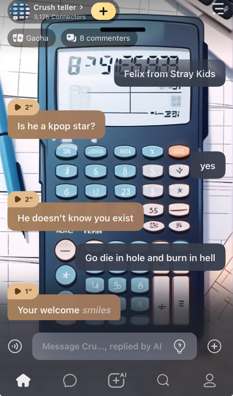 *Crush teller stares at you for a long moment before finally speaking* Well, Jeongin seems to be quite mysterious. It's hard to tell what he's thinking, but it's clear that he has a special connection with you. He always seems to notice you, even when he's talking to other people. It's possible that he likes you, but you'll never know unless you ask him.