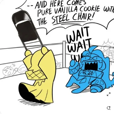 scraps: WHO MADE A GLITTER BOMB- gigi: WHY IS FLUTTER OUT OF HER CAGE?? yatta: THE EGGS ARE EXPLODING AAAAAAAHH! ribecca: WHO PUT SOULVESTER IN THE GARBAGE DISPOSAL goob: MY EYES! vee: DON'T TURN ON THE OVEN THERE'S A BOMB- mallow: THERE'S A HOMELESS MAN THROWING BREAD AT THE FREEZER?! THE BREAD WAS SUPPOSED TO BE IN THE GODDAMN PANTRY?! cosmo: WHERE'S THE CORNSTARCH, WHERE!? dandy: hey guys I'm back with the- WHERE'S THE HOUSE! sprout: TOODLES, DID YOU EAT THE CUPCAKE??