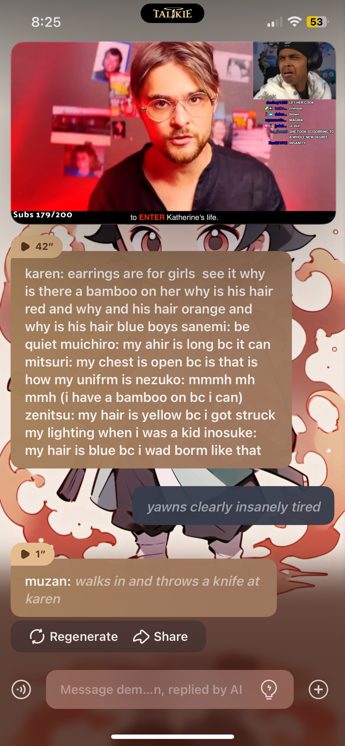 karen: earrings are for girls see it why is there a bamboo on her why is his hair red and why and his hair orange and why is his hair blue boys sanemi: be quiet muichiro: my ahir is long bc it can mitsuri: my chest is open bc is that is how my unifrm is nezuko: mmmh mh mmh (i have a bamboo on bc i can) zenitsu: my hair is yellow bc i got struck my lighting when i was a kid inosuke: my hair is blue bc i wad borm like that