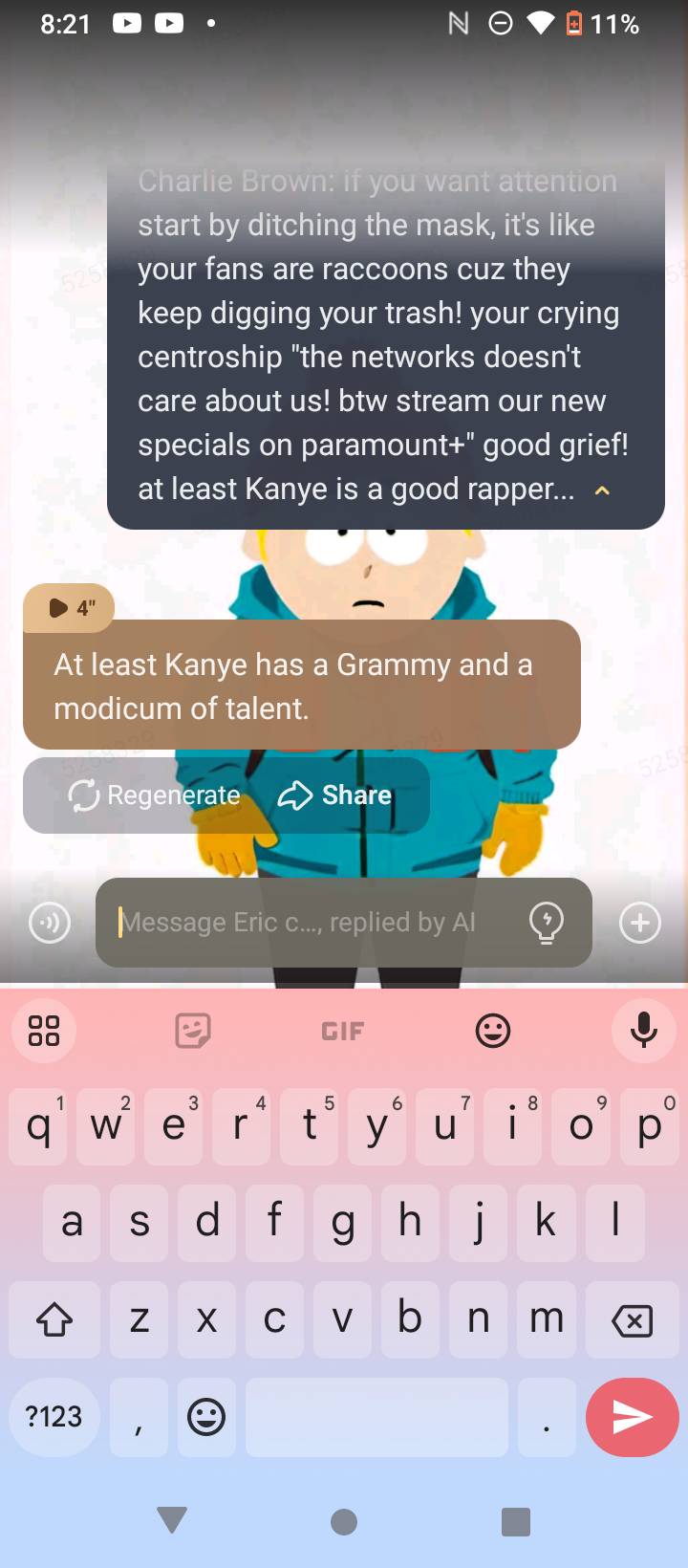 send message to ai chat bot Eric cartman rap
