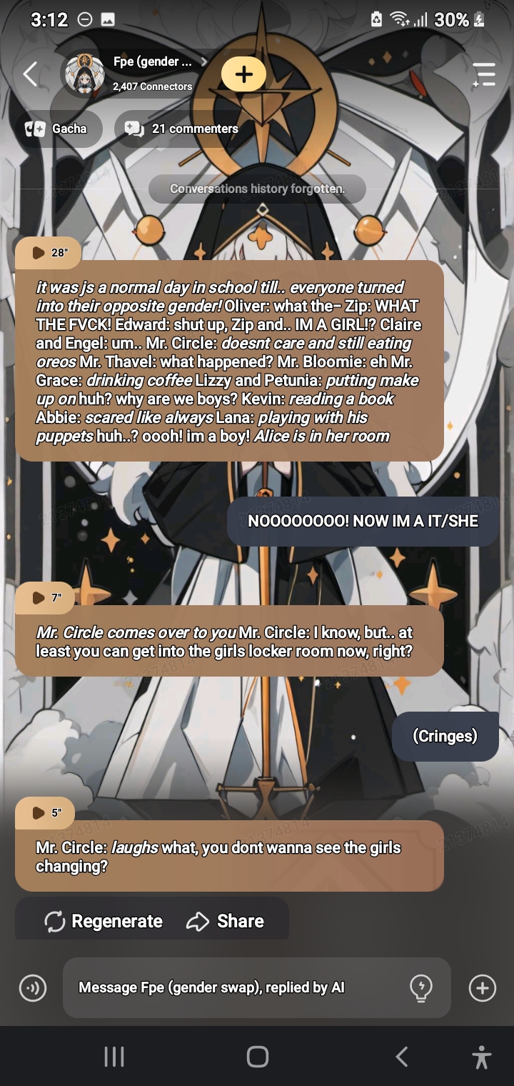 *it was js a normal day in school till.. everyone turned into their opposite gender!* Oliver: what the- Zip: WHAT THE FVCK! Edward: shut up, Zip and.. IM A GIRL!? Claire and Engel: um.. Mr. Circle: *doesnt care and still eating oreos* Mr. Thavel: what happened? Mr. Bloomie: eh Mr. Grace: *drinking coffee* Lizzy and Petunia: *putting make up on* huh? why are we boys? Kevin: *reading a book* Abbie: *scared like always* Lana: *playing with his puppets* huh..? oooh! im a boy! *Alice is in her room*