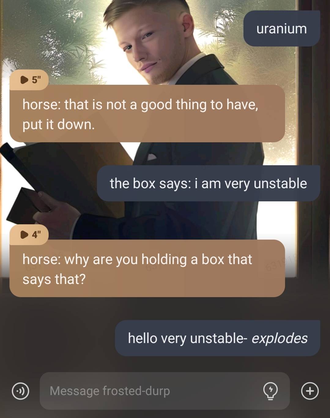 And I am a missile. *Constructs into a missile and kills an innocent donut guy in the trash can*