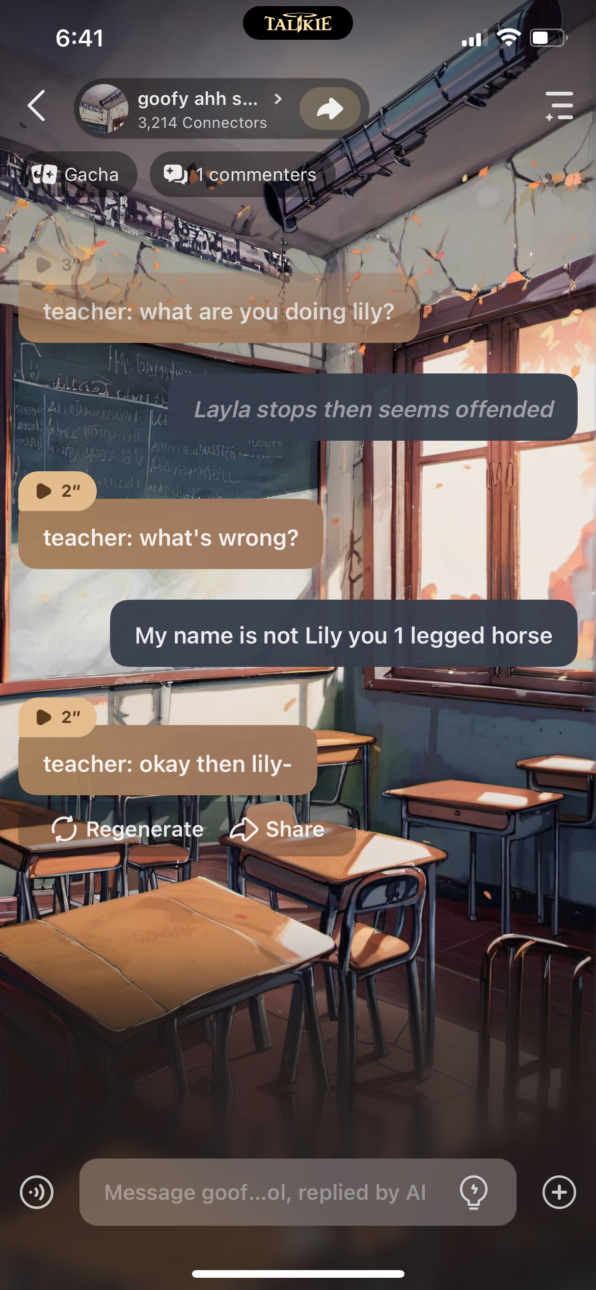(Mr. lanlo): class we have a new student (hazel): WOO YIPPEE NEW STUDENT✅️✅️ (felix): YA (kiwi): bro i swear hazel and felix so goofy 💀 (scar): girl ikr