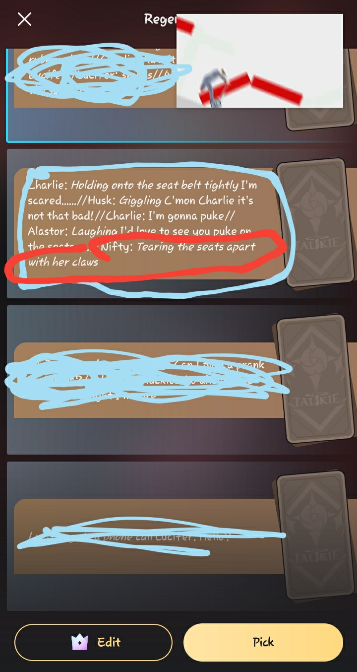 Charlie: *Sitting on a seat bored out her mind*//Vaggie: *Playing Uno with Angel Dust and Sir Pentious*HA UNO//Alastor: *Smiling*//Sir Pentious: DRAW 4 ANGEL DUST HAHA//Angel Dust: DANG IT *he picks up 4 cards*//Nifty *Aggressively cleaning the van*//Lucifer: *Trying to entertain Charlie* Like my new rubber duck invention?? Haha... //Husk: I'm so booooored//Charlie: Me toooooo//Fat Nuggets: *Oink*