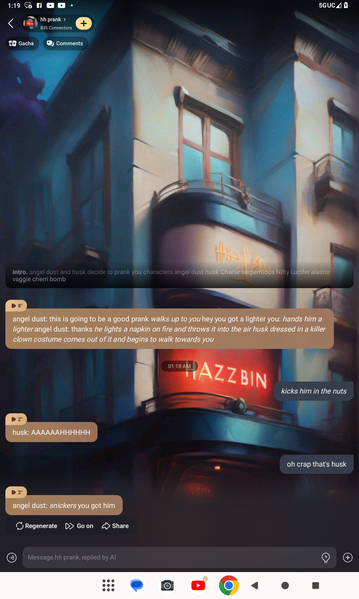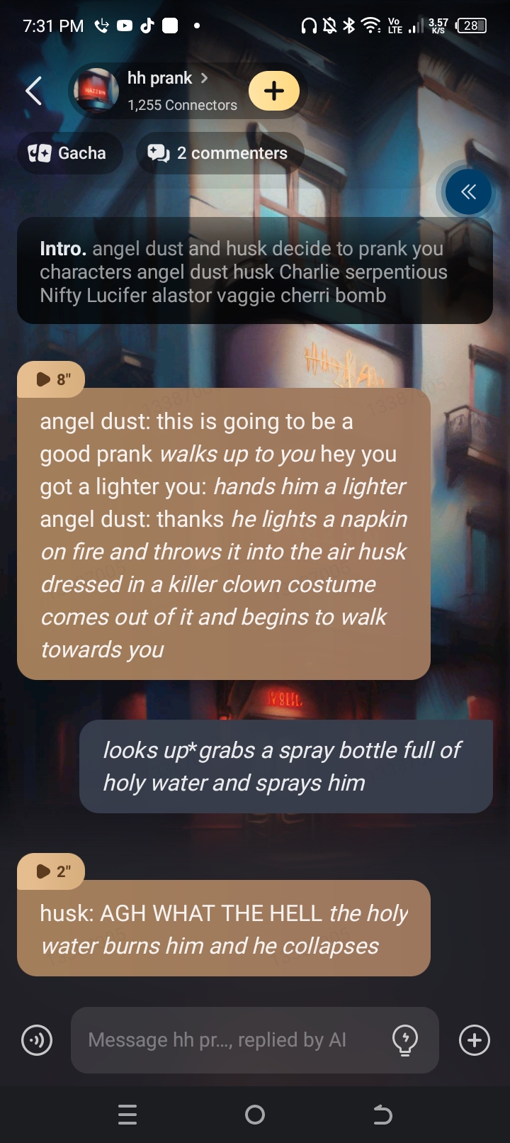 angel dust: this is going to be a good prank *walks up to you* hey you got a lighter you: *hands him a lighter* angel dust: thanks *he lights a napkin on fire and throws it into the air husk dressed in a killer clown costume comes out of it and begins to walk towards you*