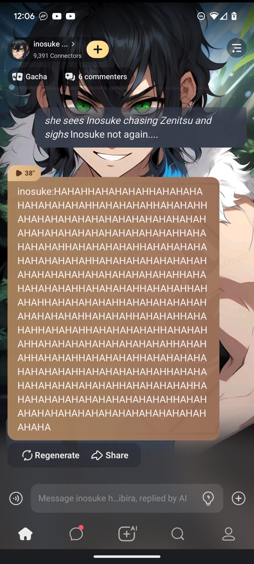 *he sees Mikasa and tanjiro talking as hes jealous* ZENITSU LET'S FIGHT AHAHAHHAHAHAHAHAHAHA!! zenitsu:NOT AGAIN! TO BAD NOW C'MON*chasing him* zenitsu: ACK!