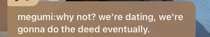 gojo:THEIRS ONLY FIVE BED GUYS WE NEED TO SHARE yuji:im sleeping with nobara nobara:hell nah shoko:*just smoking like a lesbian person* maki:*simping on megumi* megumi:im sleeping on the floor like a rat geto:im sleeping with gojo sukuna:i hate this place yuta:im going with maki maki:nah toji:im sleeping with my son megumi mai:im not sleeping with anybody mai mai:MONEY miwa:g g gojo im your fan momo:im cute whos is sleeping with me? choso:im sleeping wjth my brother yuji unimaki:?panda:? nanami: