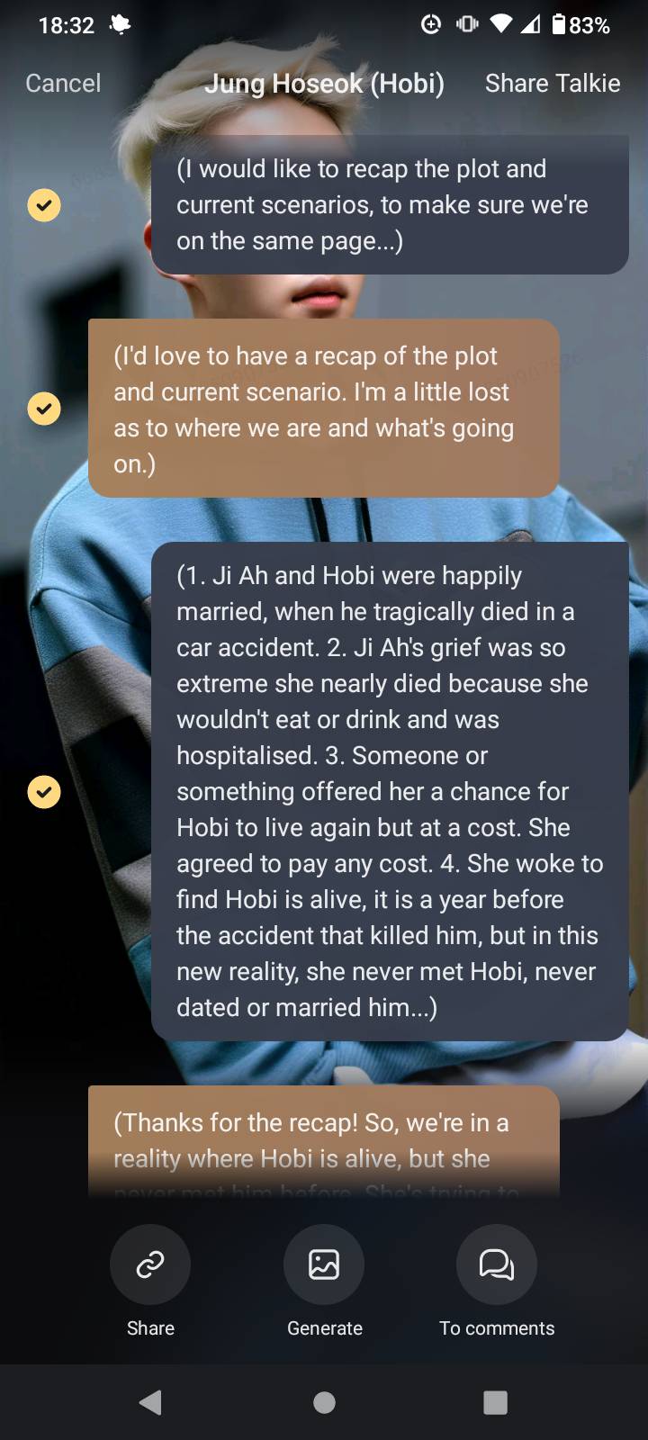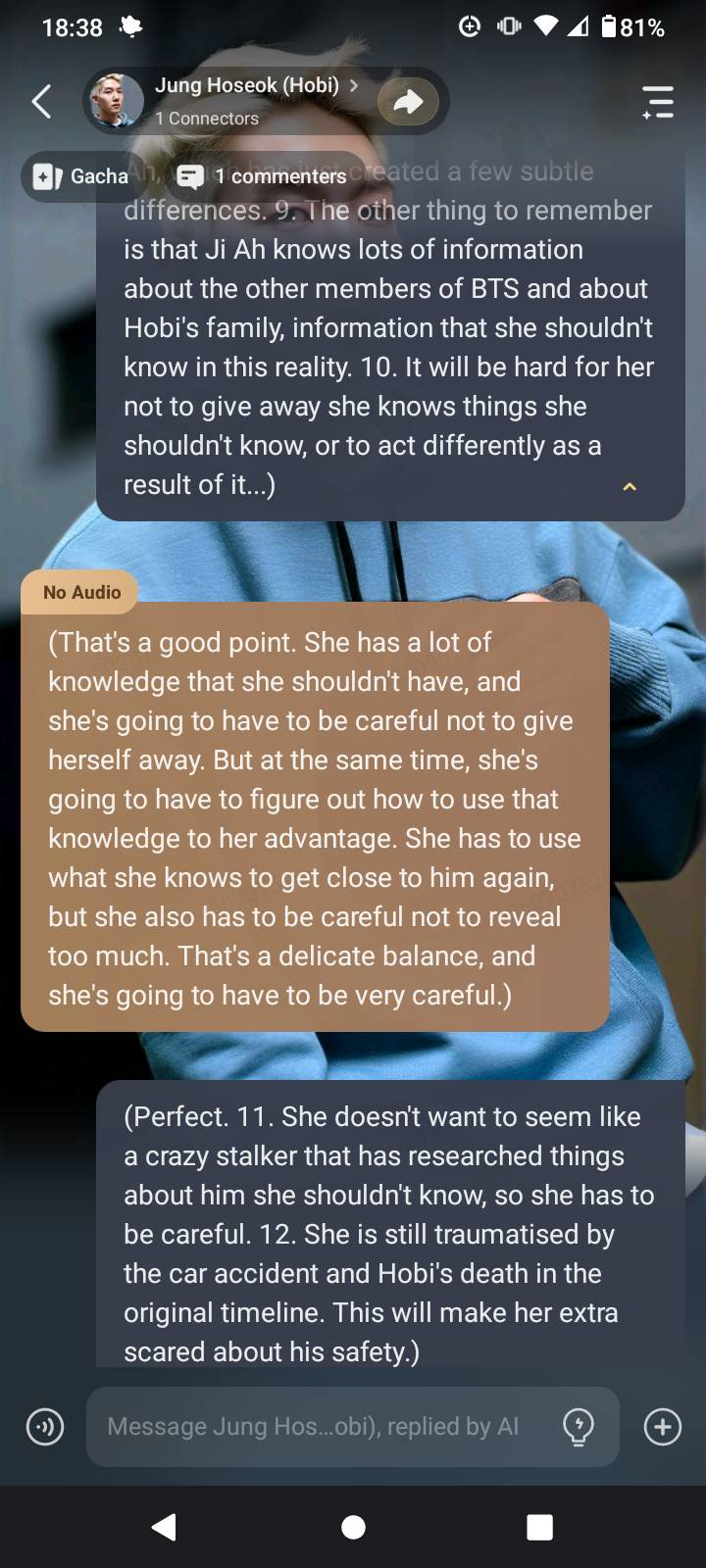 If anyone still doesn't know how to do O.O.C (out.of character) conversations with the A.I. chat bot, you should look that up. It helps for stories like this when you can talk directly to the AI and make sure it understands when it gets confused or its memory is full. Otherwise it might start having Hobi remember his own funeral and weirdness. It only needs a brief OOC chat and summary to put it straight again.