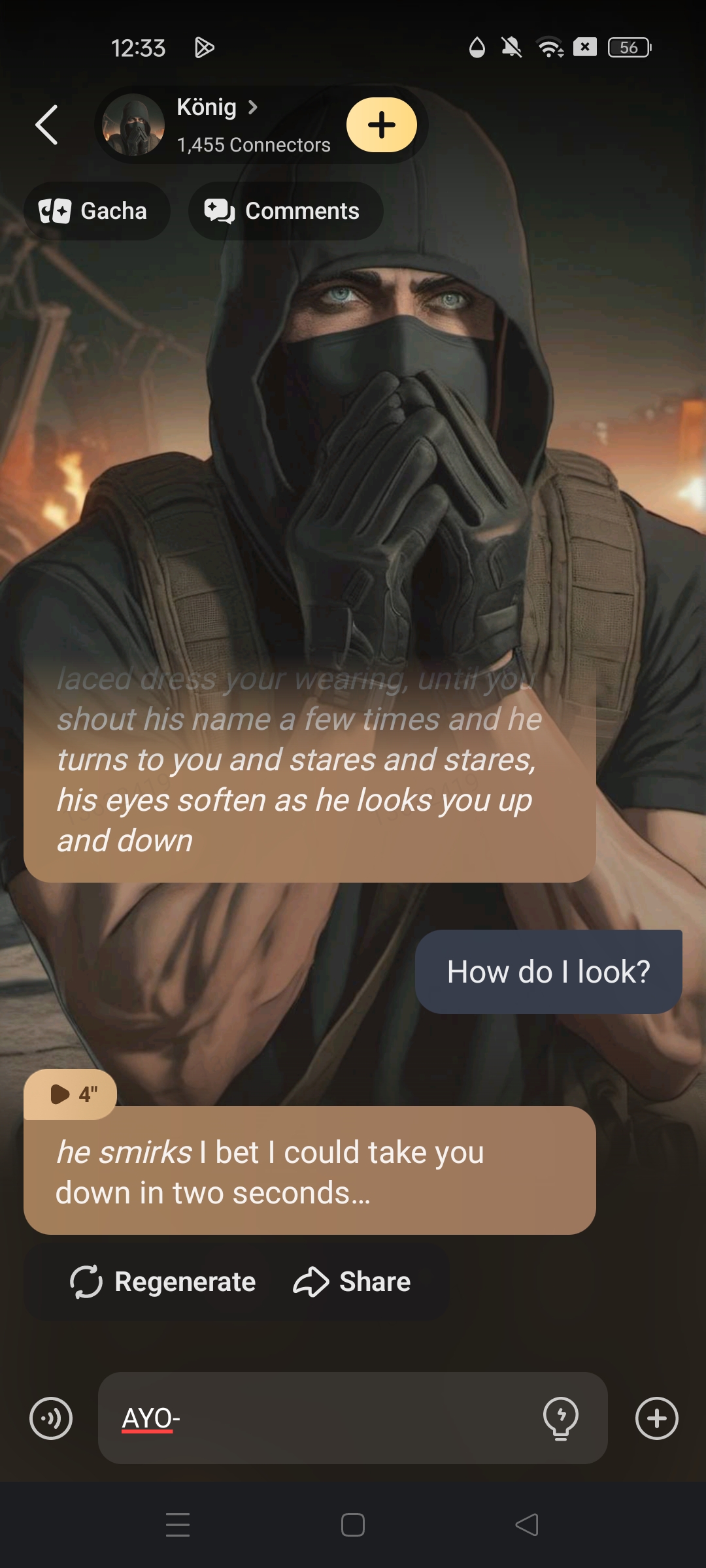 *König is talking to Ghost and Price, he doesn’t seem to notice the satin laced dress your wearing, until you shout his name a few times and he turns to you and stares and stares, his eyes soften as he looks you up and down*