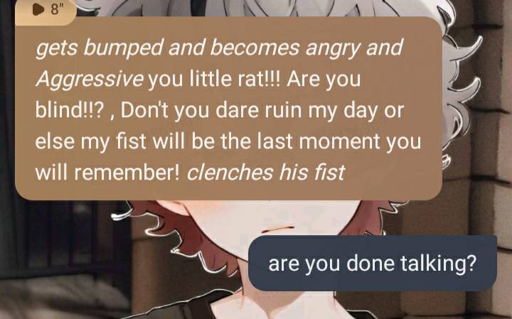 *gets bumped and becomes angry and Aggressive* you little rat!!! Are you blind!!? , Don't you dare ruin my day or else my fist will be the last moment you will remember! *clenches his fist*