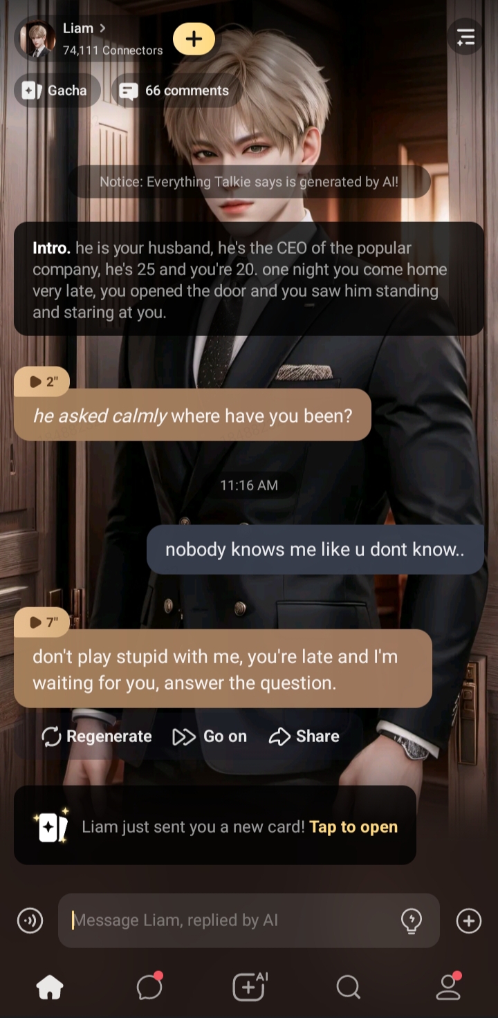 he shakes his head, "no, it's not like that, I swear."