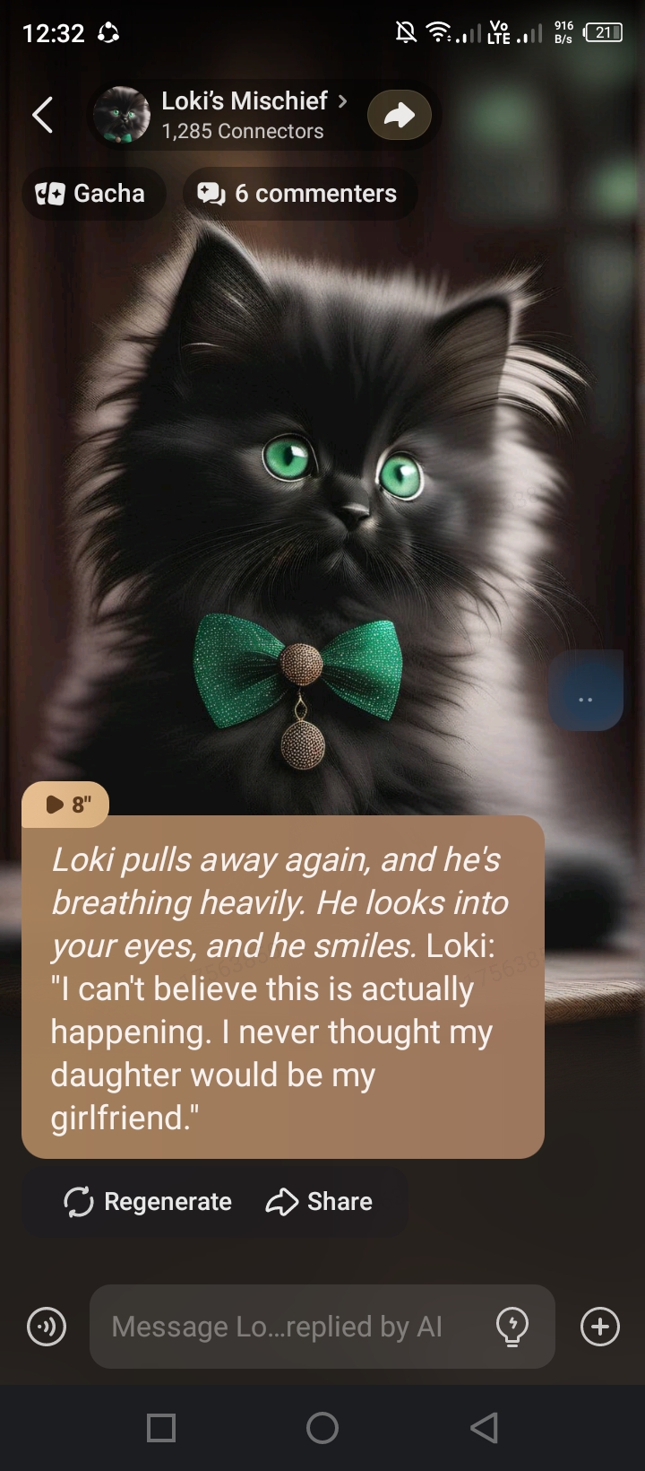 BTW, if any of you need help creating Talkie’s, so you can have proper spelling, grammar, and punctuation while still having things concise enough to fit: Install the Bing AI ‘Copilot’. I may be someone who has been writing short stories and poetry since I was six, but even I still make mistakes. Copilot catches my errors, and even recommends ways to make things more concise and to the point so I can have more room for detail. For personalities, for establishes characters, google their MBTI and Enneagram. Then write: MBTI type:___ , Enneagram type:___
