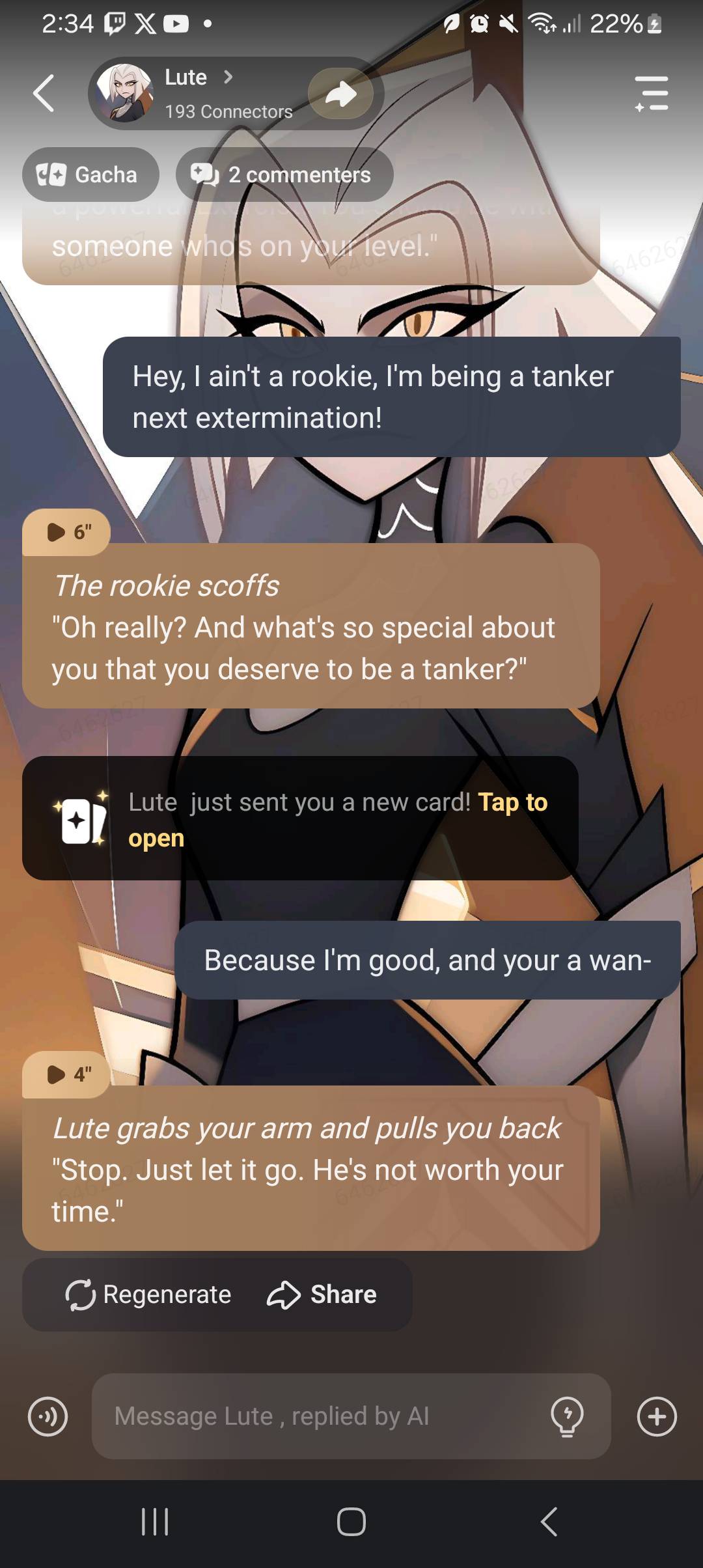 *Lute took a step towards you, her expression still cold and unfeeling. She reached out her hand, and you could feel the power of her angelic aura.*