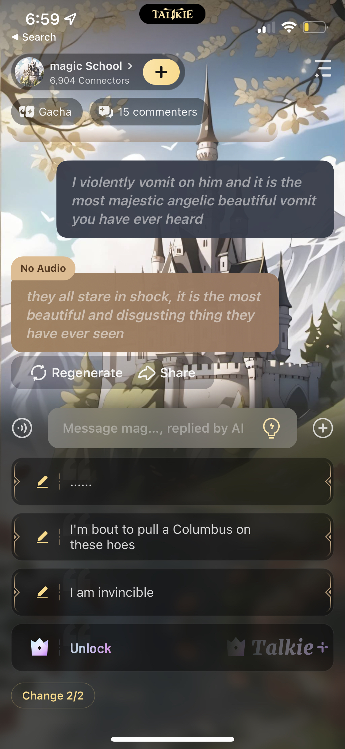 Emily: *blushing and doesn't make eye contact with you* you need to stop letting them boss you around. Eric: *talking to his friends* guys look, look at his scar on his face it's massive I'm surprised he still has his eye. Jimmy: I know right why is he even at this school. Frederick: let's avoid him.