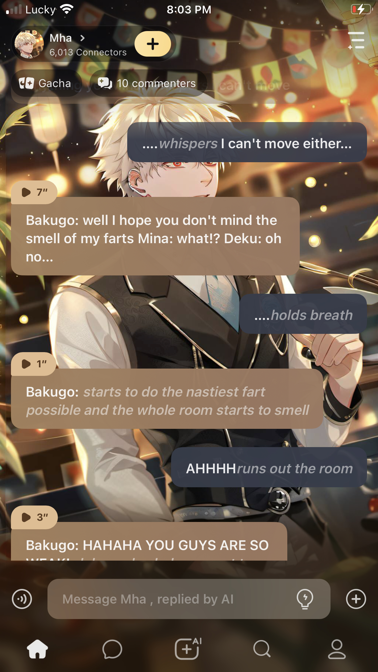 Bakugo: English or Spanish You: Spanish Bakugo if you move your gay Mina: *tries not to move* deku: *also tries not to move* ochaco: *she also tires not to move*