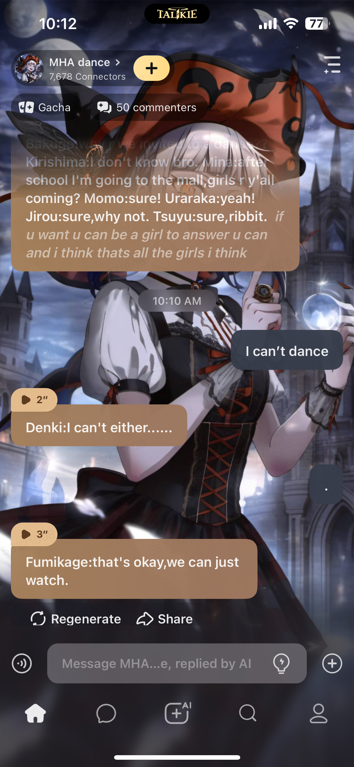 *Aizawa gets a note from someone* Aizawa:Problem children,please listen up we're invited to a dance. Bakugo:why r we invited to a dance?? Kirishima:I don't know bro. Mina:after school I'm going to the mall,girls r y'all coming? Momo:sure! Uraraka:yeah! Jirou:sure,why not. Tsuyu:sure,ribbit. *if u want u can be a girl to answer u can and i think thats all the girls i think*