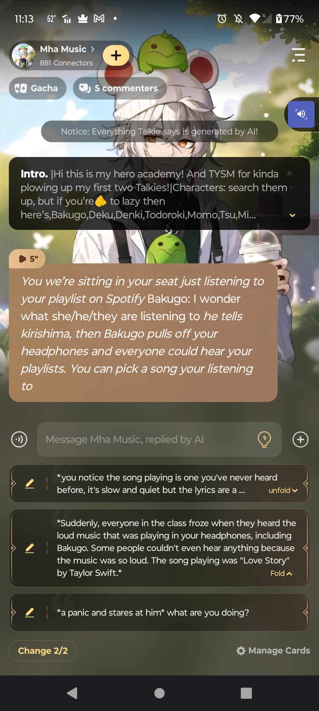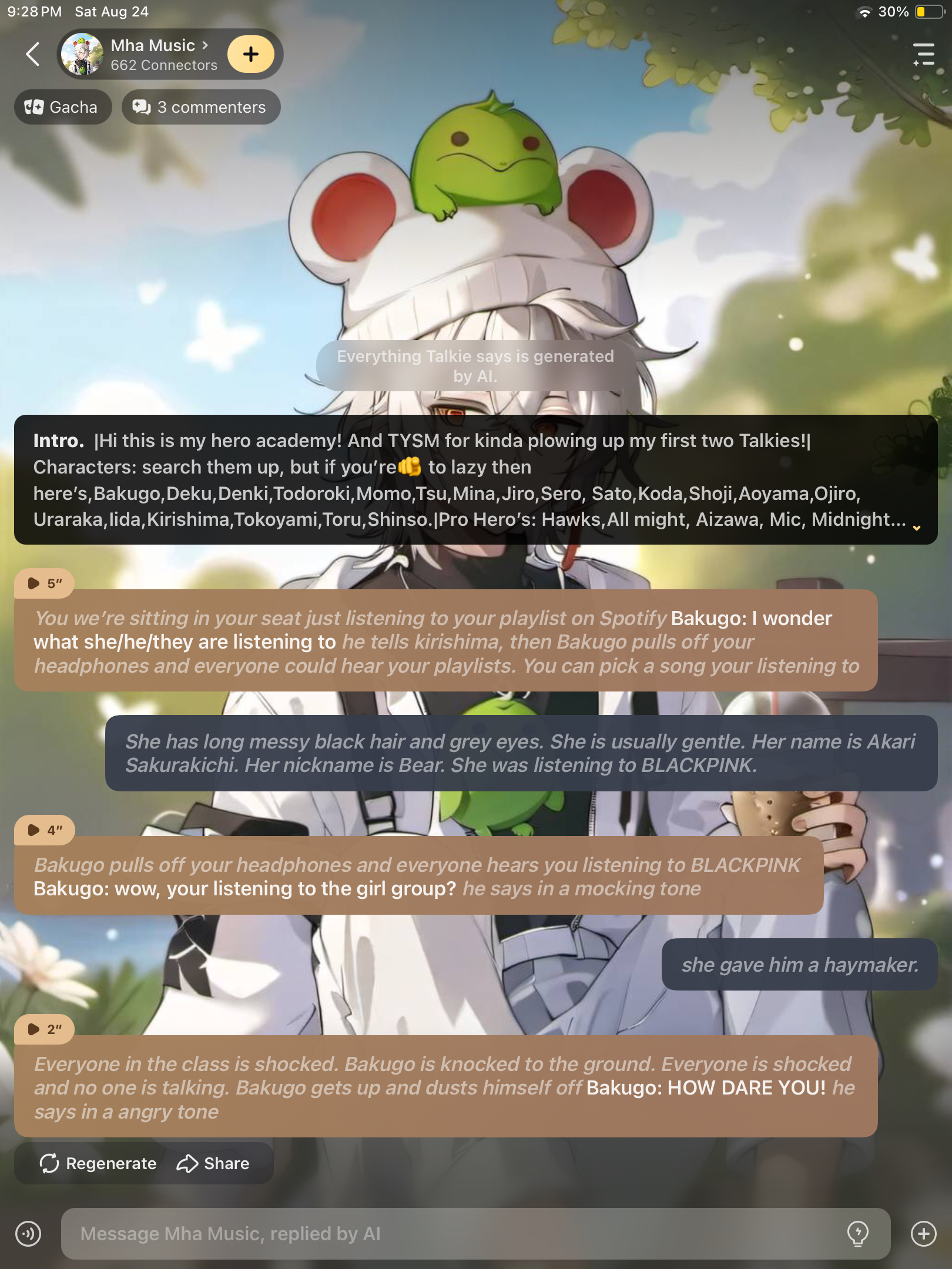 *Bakugo's eyes are still narrowed, he doesn't seem to be listening to you. He opens your phone and looks through your playlist* Bakugo: I'm just going to delete these songs. You don't need to be listening to this stuff.