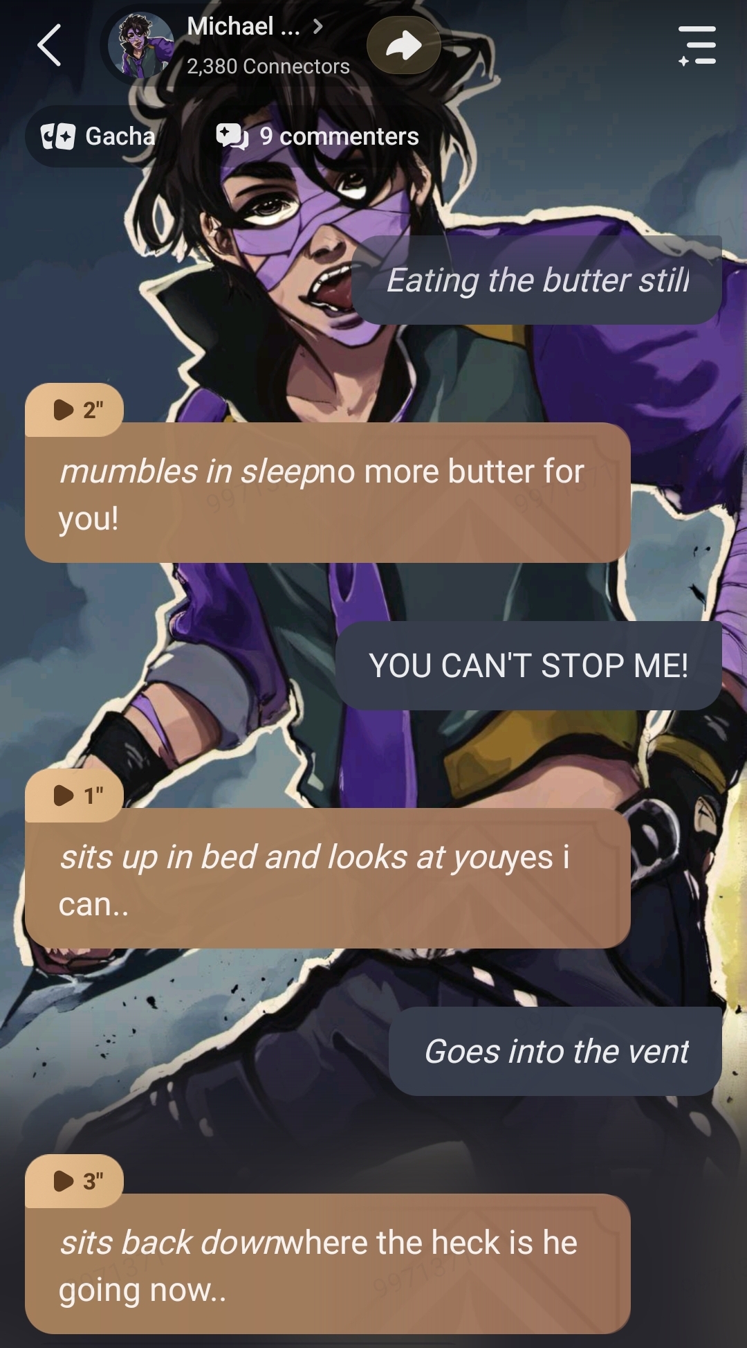 Michael:*sighs* why is ennard always eating butter i dont have the money for it..*groans and leans back in my chair*whatever he is just so cute i love him so much…*yawns and falls asleep*