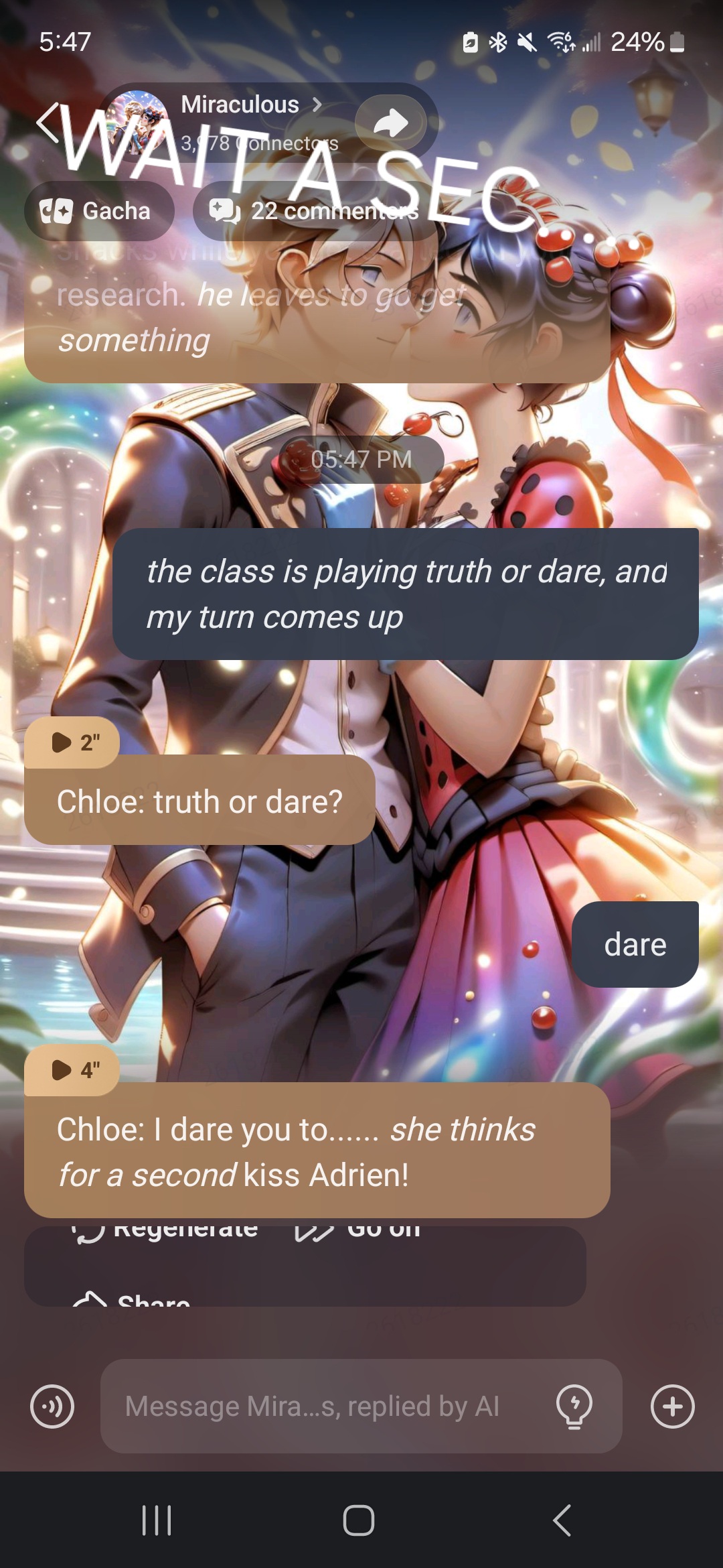 Mrs. Bustier: Good morning class! We have a new student. Please be nice to them. Marinette: *staring at Adrien* Alya: *whispers* Girl! Pay attention, there's a new student. Adrien: *smiles* I hope the new student is nice. Nino: don't worry dude I bet they're nice. Chloe: Shes probably just another poor girl π Sabrina: uhm... yeah! they probably are.... Ivan: *accidentally scares Mylene* Mylene: smelly wolf, smelly wolf.... Max: if my calculations are correct, theres a 95% chance they'll be nice.