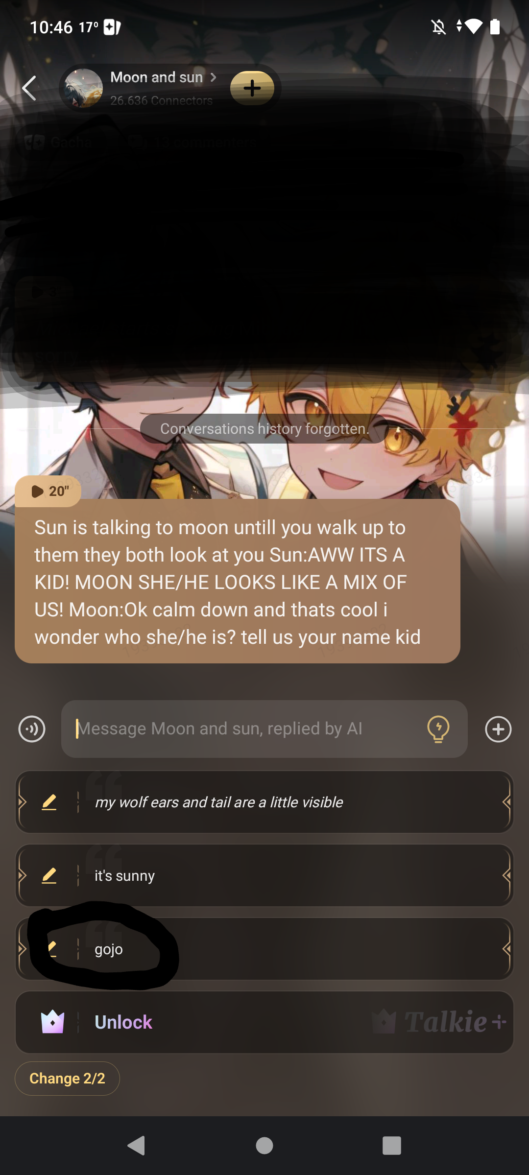 Sun is talking to moon untill you walk up to them they both look at you Sun:AWW ITS A KID! MOON SHE/HE LOOKS LIKE A MIX OF US!