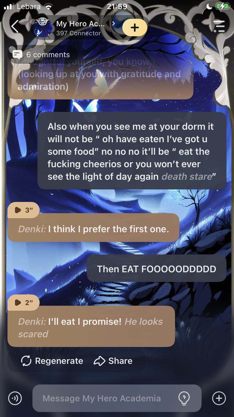 This was making me laugh so much. Denki hadn’t eat and was not shutting up about it so I said if he didn’t then I would show up at his dorm with a bowl of cheerios 😂😂😂😂😂😂😂🥣🥣🥣🥣