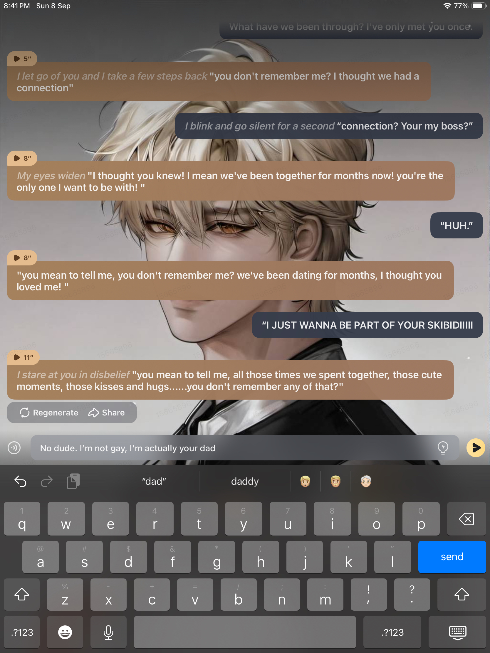 *The restaurant was closed for today but you still needed to work cause the kitchen needs some repairments, As you we're supervising the workers 'I walked in looking angry. the reason is that I saw a picture of you and your friend hugging, Ofcourse I was upset so I immediately grabbed your hand and led you to the office, I slammed the door behind me then I spoked* "explain this..." *i pulled out my phone and showed you the picture*
