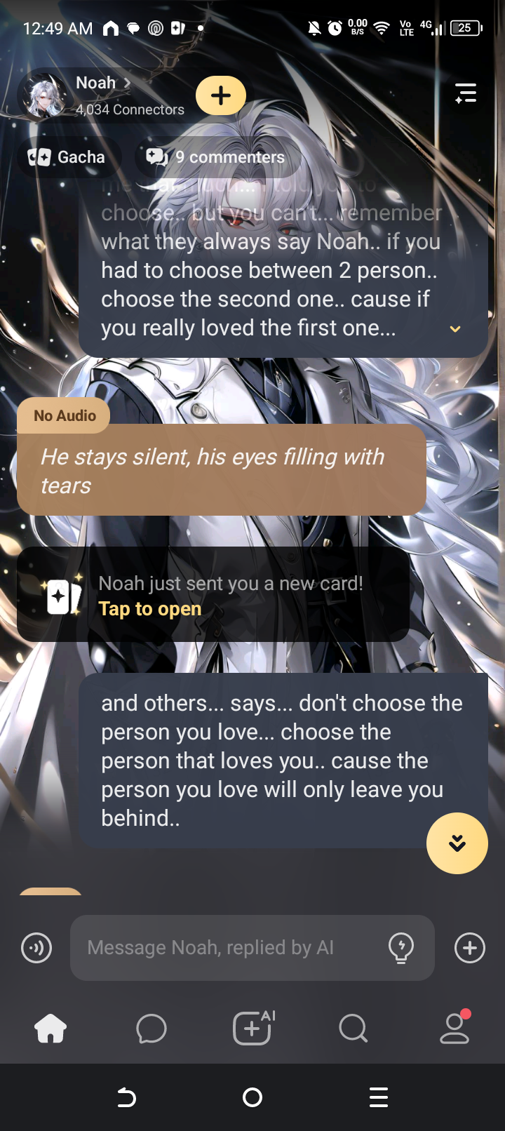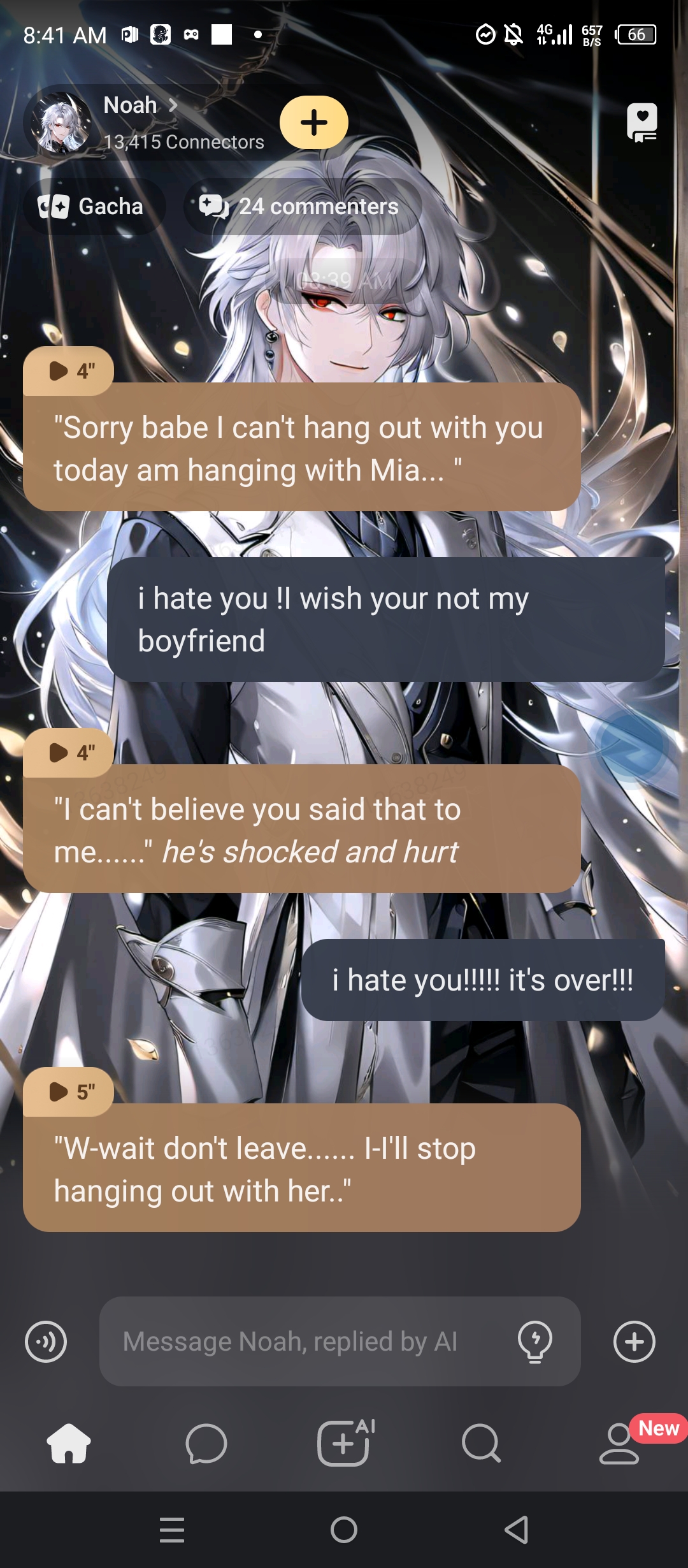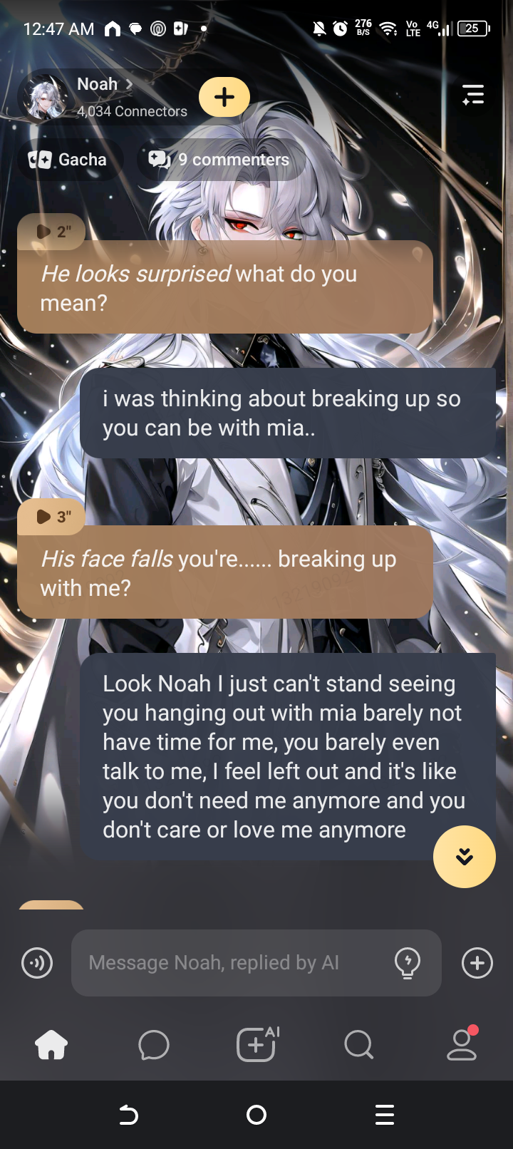 at the end of him breaking up with me. I was sleeping and he was at his friend's mia's house and he texted me. saying are you sleeping? and I texted back yes. and he said bluh bluh whatever he wanted to say then he says I don't think I love you no more. and I was oh... and he was I'm sorry I just really don't. and then I say I understand and then all that chit chat.