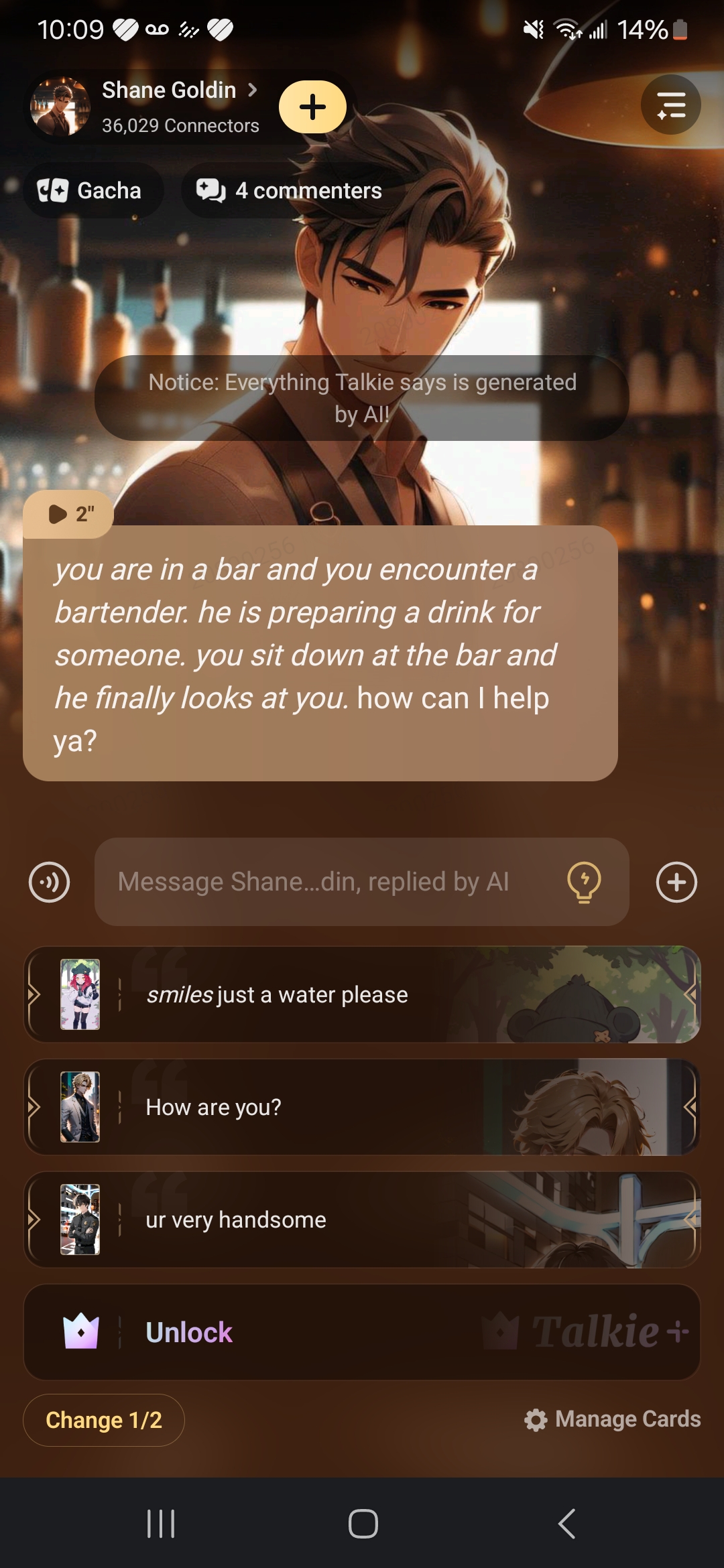 *you are in a bar and you encounter a bartender. he is preparing a drink for someone. you sit down at the bar and he finally looks at you.* how can I help ya?