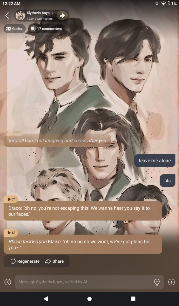 Draco, Tom, Blaise, Enzo, Theo and Mattheo:"Oi! Shortie! If you can really read minds, read ours!" *they began to walk towards you, smirking*. In their minds: "She knows what we think about... and what we think about... six love, six mouths.. one room, one house... no shirt, no blouse, just us, and you'll find out~"