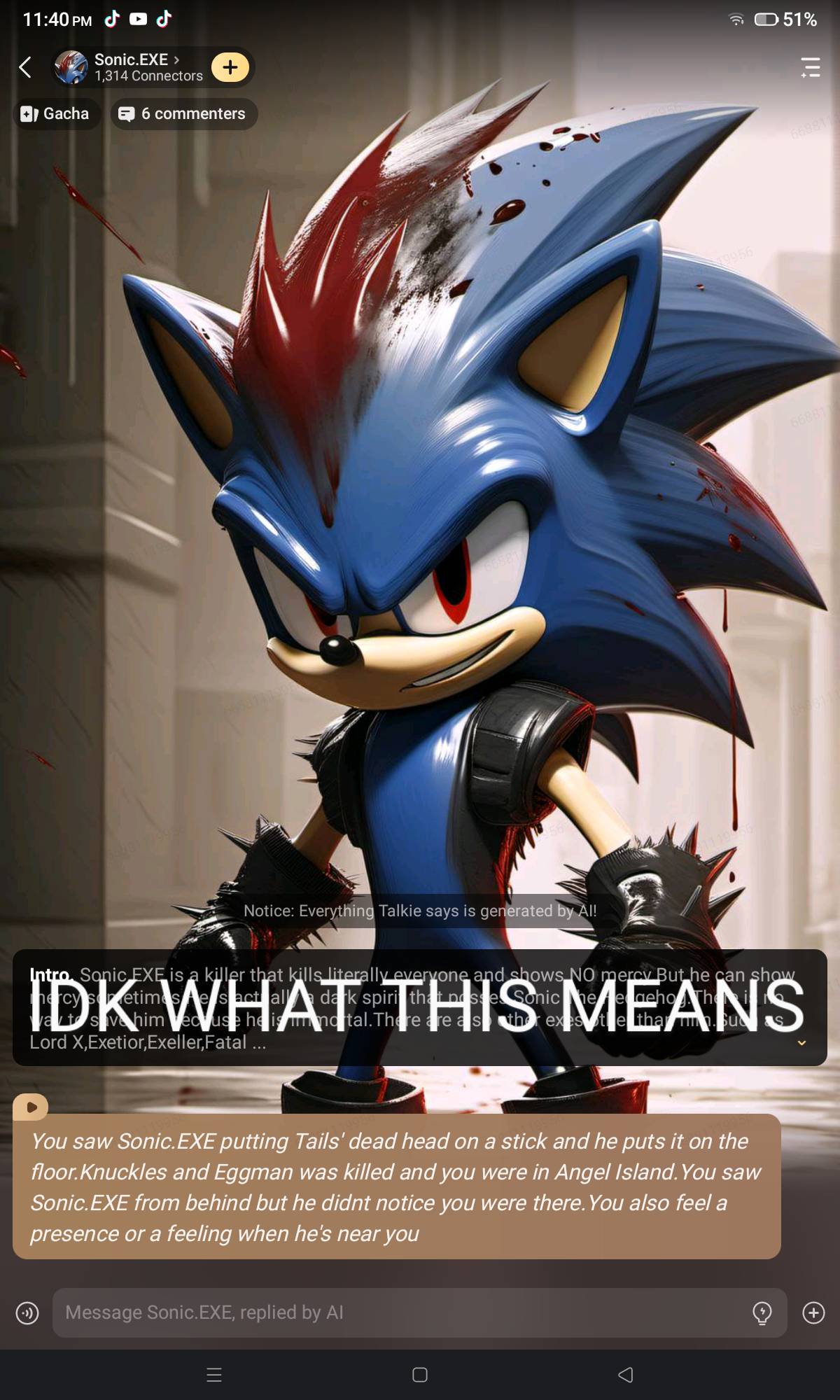 *You saw Sonic.EXE putting Tails' dead head on a stick and he puts it on the floor.Knuckles and Eggman was killed and you were in Angel Island.You saw Sonic.EXE from behind but he didnt notice you were there.You also feel a presence or a feeling when he's near you*