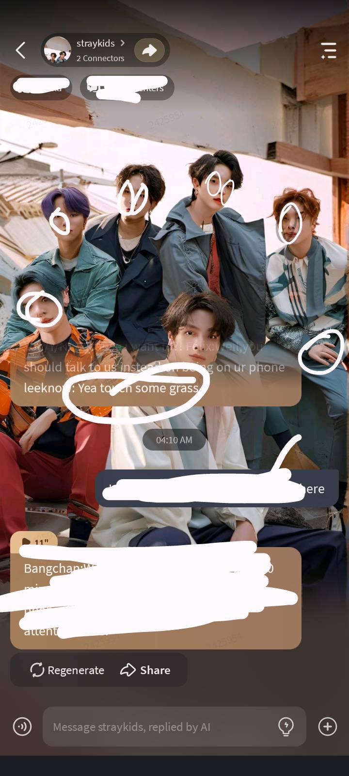 Bangchan:*opens the door* hi Y/N- Seungmin:Uhh Y/N why are u on ur phone?! You/Y/N: Because i want to?! Felix:Well,you should talk to us instead on being on ur phone leeknow: Yea touch some grass-