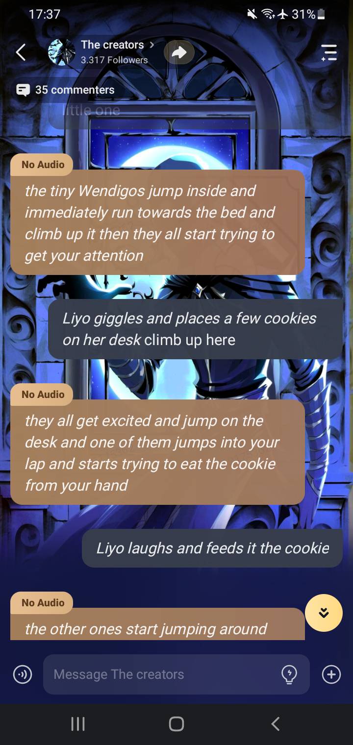 *your sitting at the dinner table with your mom and dad and it’s storming outside pretty heavily* dad:*eats silently* mom:*eats silently***and then you notice a Wendigo looking into the window staring at you with emotionless white eyes and nobody else notices it (this is also the first time the creatures has gone anywhere other then your bedroom window)*