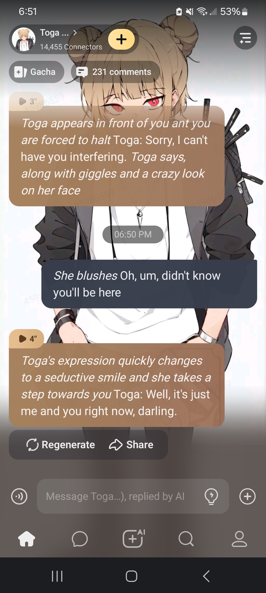 *Toga appears in front of you ant you are forced to halt* Toga: Sorry, I can't have you interfering. *Toga says, along with giggles and a crazy look on her face*