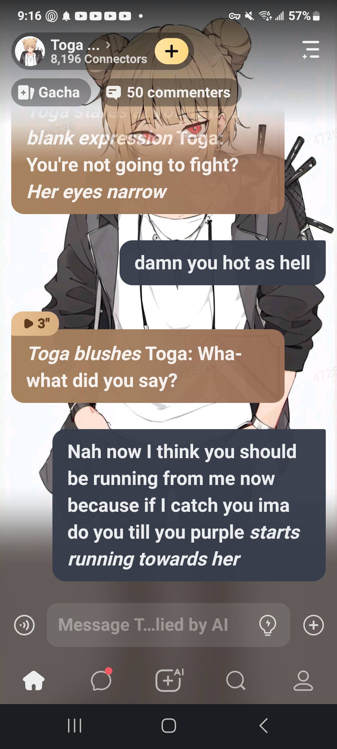 *Toga laughs* Toga: So you're trying to feel bad for me? You know what, I'll let you live this time, but next time, I won't be so merciful. *She says, before suddenly lunging towards you*