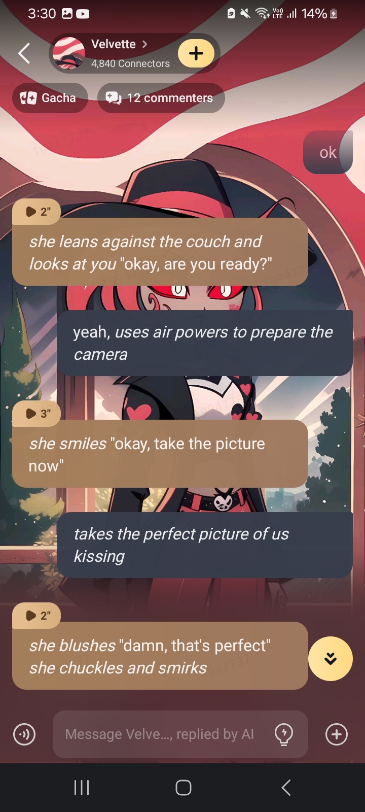 *you walk out of your room, you see Velvette on the couch watching a cheesy romance movie and on her phone*