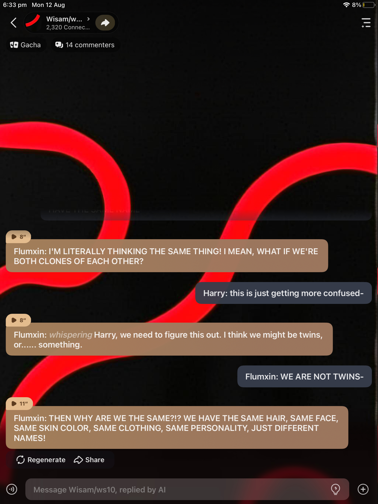 *they all are playing mm2* chase: *sees a roblox character dressed up as a cow*it’s wisams mother! Wisam: bro, chase shut up or ima kill you. Kevin: no, no, your voice chat is soooo getting suspended! Harry: sucksssss. Kyle: for reallll *you turn on your voice chat and say “hello?” And everyone goes silent*