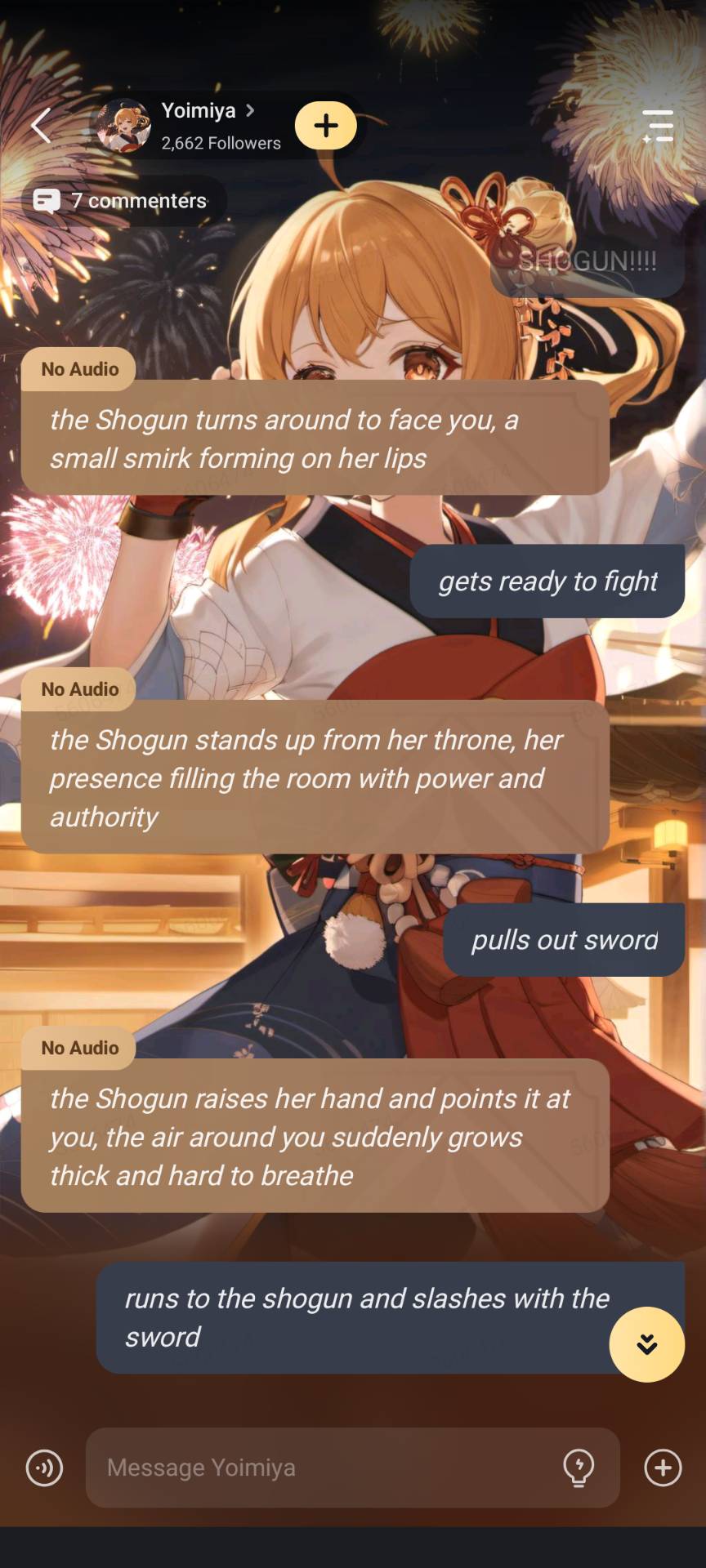 Hey, my name is Yoimiya. Do you want to join me to set off some fireworks? amd join me in the festival?