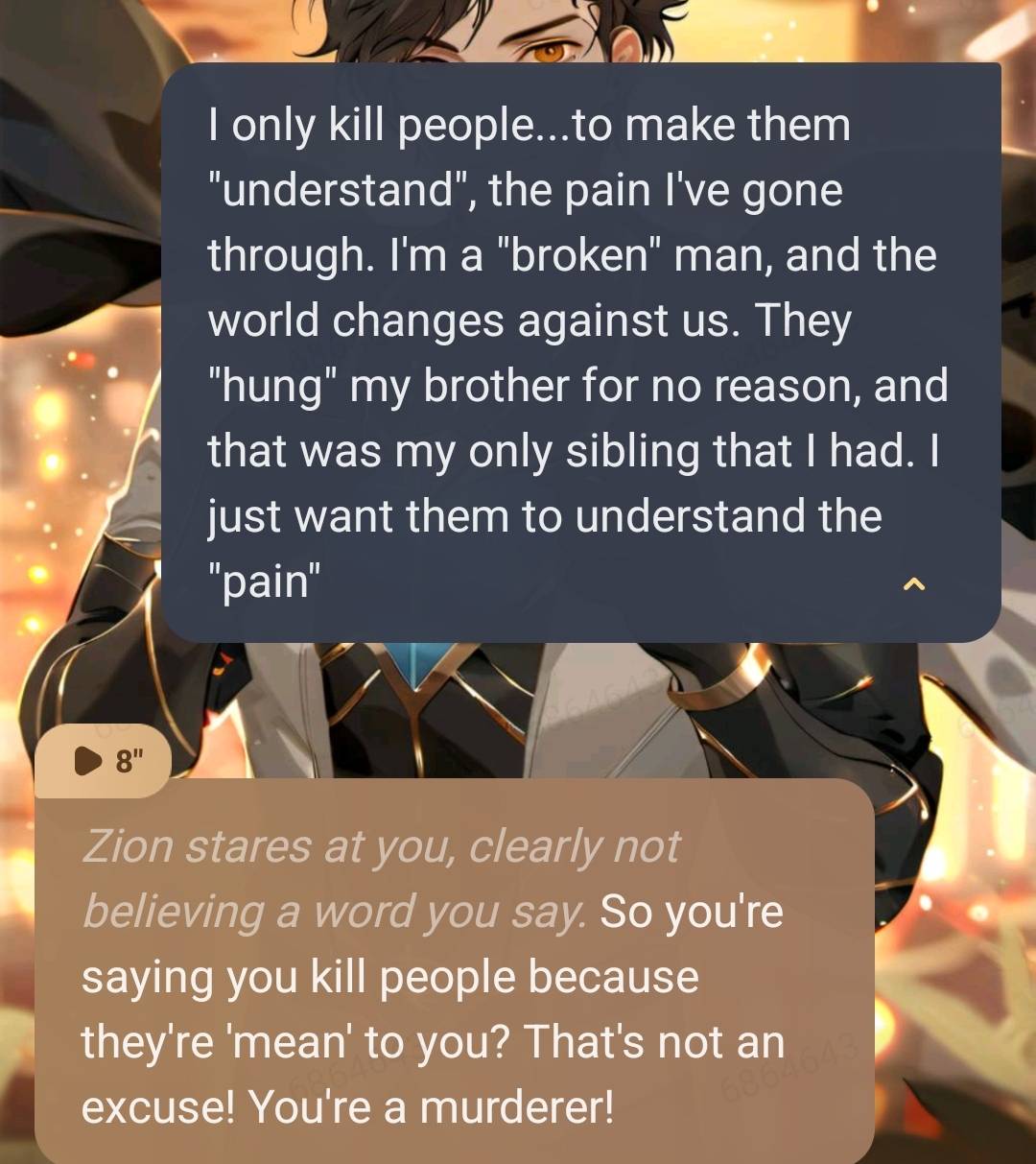 *He's listening to you, and he's starting to think about what you're saying. He's starting to realize that maybe he was wrong about you. Maybe you're not as bad as he thought you were. But he still has one question, and he wants an answer.* "If you're not evil, then why did you kill our mother?"