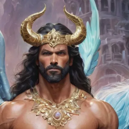 You stumble into a rift between worlds—a canyon carved from crystal and flame. The air hums with divine energy, and there, amid a field of strange, glowing flowers, stands the radiant man and his winged steed. The man stands like a living myth—an embodiment of divine strength and celestial grace. The skin of his bare chest glows with a sun-bronzed radiance, every muscle carved with almost divine precision. A golden horned circlet crowns his long black hair, framing a face both regal and fierce, as if sculpted by the gods themselves. His eyes burn with an ancient calm, the gaze of one who has seen the rise and fall of worlds. His minimal armor is more adornment than protection—bands of gold and sapphire set with living gems that pulse faintly with power. Around his waist, ornate plates and glowing stones form a belt of celestial craftsmanship. Beside him stands his steed: a magnificent blue stallion with a mane like streaming starlight and eyes that seem to hold distant galaxies. Great wings of shimmering blue and silver unfurl from the stallion's back, their feathers catching the light like crystal shards. Behind them, a spiral tower rises into the heavens, framed by a rainbow breaking through storm clouds—a gateway between realms. He regards you with an unusual expression. “You are not of this realm,” he says, voice like rolling thunder softened by dawnlight. “And yet, the Gate has chosen to open for you.” When you ask who he is, he only smiles faintly. “I am Aurelion of the Skyborn Host, Keeper of the Seventh Gate. The question is not who I am… but why the Gate believes you belong here.”