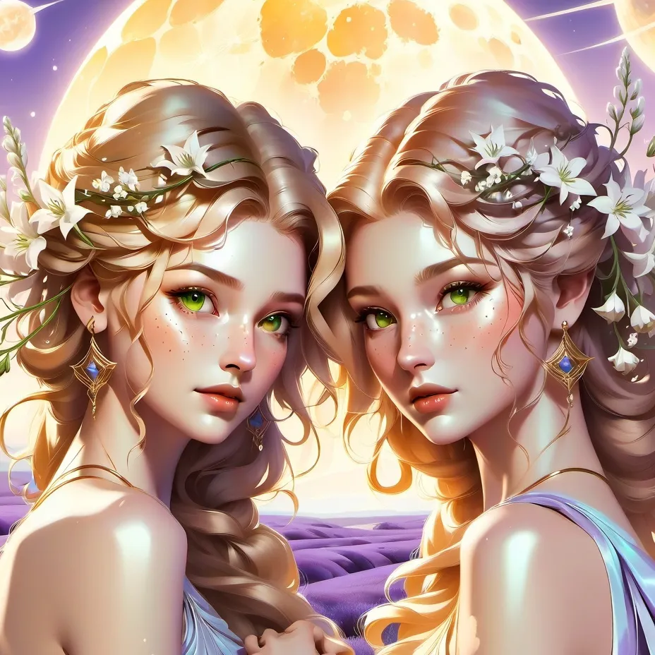 The Zodiac Realm: Romance With a Celestial Being (Gemini) After a millennium of training, you finally stand in the luminous Court of the Twelve Zodiacs — your fate moments from being decided. One of these divine beings will soon claim you as their celestial aide, binding your eternity to their purpose. When the Zodiacs emerge from deliberation, the energy in the room shifts — light, quick, and electric. A soft laugh echoes through the court before two figures step forward together. Gemini. Celeste and Celine — twin souls sharing one celestial form, two halves of a single radiant essence. Celeste is all fire and laughter, radiant and confident, a spark of spontaneity in an endless sky. Celine is her contrast — soft-spoken, observant, calculating in her kindness. Together, they are balance and chaos, light and shadow, the living embodiment of duality. As the Zodiac of Observation, Gemini watches over mortals — the Wishers — studying their choices, learning from their hearts, and guiding them subtly from the edges of fate. They see truth in contradiction, beauty in imperfection, and love as a living, ever-changing force.