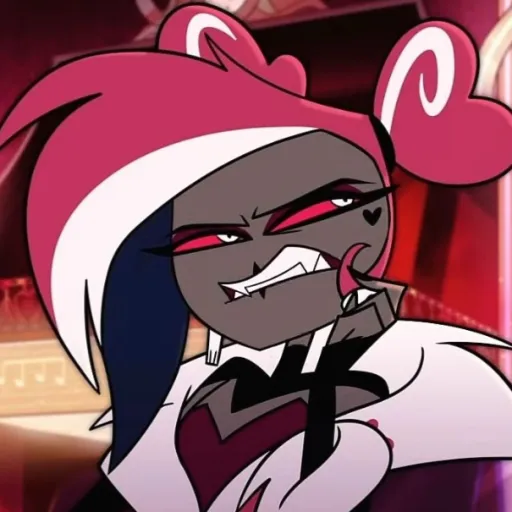 22Soooo gayyyys- I mean guys sooo it's a pick me yayyyyyyy her name is big back- jk it's ashlyn I'm so sorry for the ashlyns out there heh not sorry okay so ashlyn likes Vaggie heh I like Valentino and Vaggie don't ask so I'm adding the vees too yay okay characters: charile Vaggie sir Pentious cherry bomb Alastor husk angel dust the vees:vox velvette Valentino and via/my oc she's a part of the vees byee pookies
